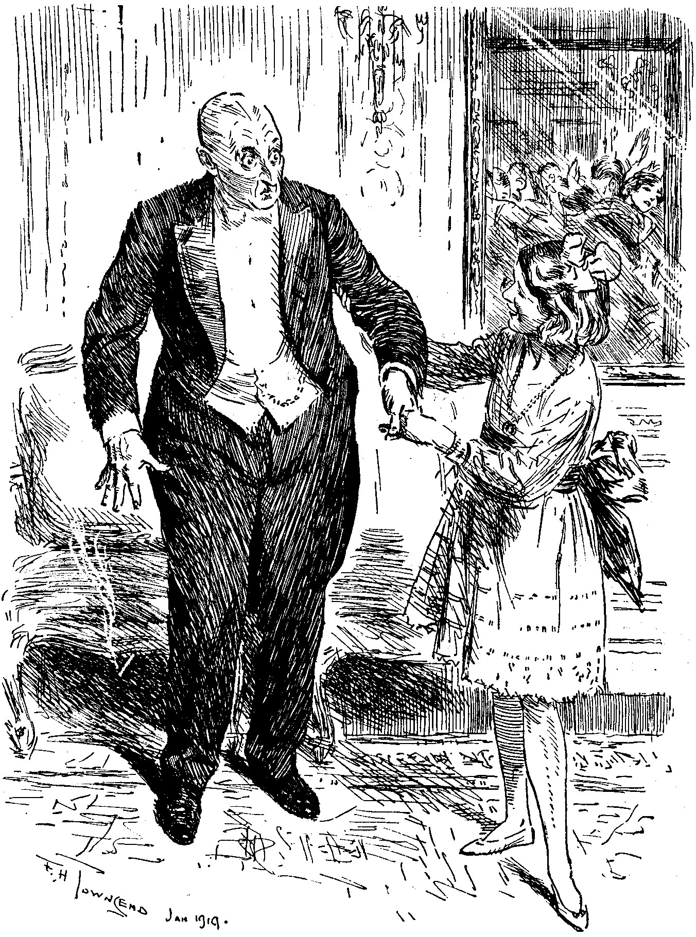 "IT'S PERFECTLY SIMPLE, UNCLE—TWO SLOW, THREE QUICK, THREE SIDE CHASSÉES, WOBBLE WOBBLE, LAME DUCK, LAME DUCK, DIP, GRASSHOPPER, TWO SLOW, SWIVEL, SCISSORS, JAZZ-ROLL, KICK, TURN, TWO CHASSÉES, BACK, TWINKLE, AND ON AGAIN.""TOO LATE FOR CLASSIFICATION.