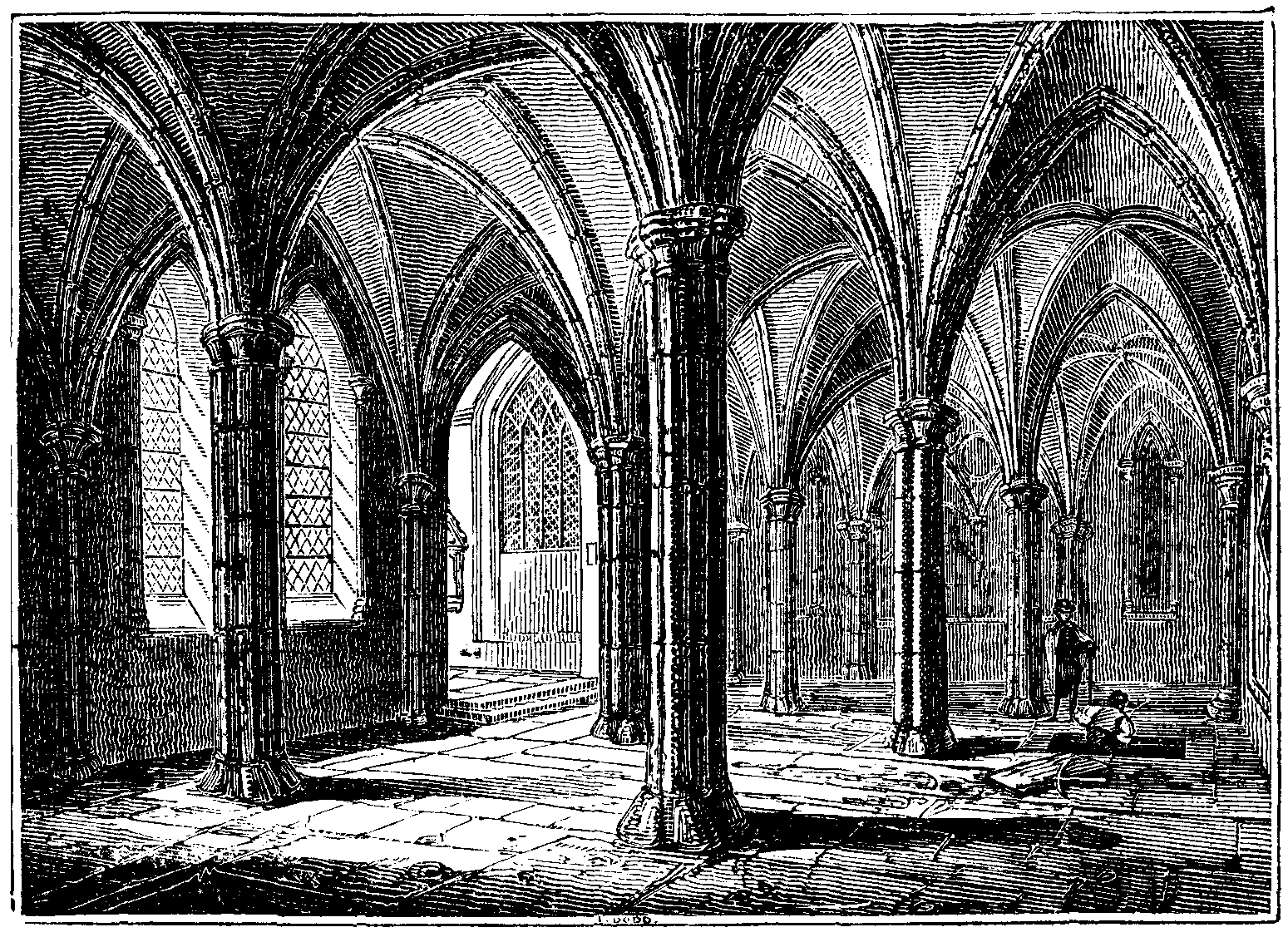 The annexed view was taken from the north-west entrance, and shows the character of the groined roof, the supporting pillars, and the entrance to the Bishop's Chapel adjoining, by an ascent of two steps; this Chapel being named from the Tomb of Bishop Andrews, formerly standing in the centre of it. We recommend the reader to a clever paper in the Gentleman's Megazine for the present month, in which the writer proves that Our Lady's Chapel, so far from being an excrescence, as has been idly stated, "bears the same relation to the church an the head does to the body."