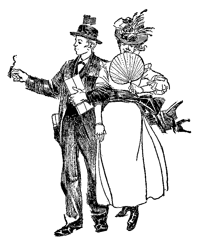 What passed in the ring as Bud left it, bedraggled and dusty, did not interest him. He brushed himself as he went. The band was playing madly, and the young woman in the stiff skirts was standing by her horse ready to mount. The crowd did not stop laughing; Bud inclined his head to dust his knickerbockers, and then in a tragic instant he saw what was convulsing the multitude with laughter. The outer seam of the right leg of his velveteen breeches was gone, and a brown leg was winking in and out from the flapping garment as he walked. Wildly he gathered the parted garment, and it seemed to him that he never would cover the ground between the ring and the benches. In the course of several æons—which the other boys measured by fleeting minutes—the wave of shame that covered Bud subsided. Pins bound up the wounds in his clothes. He drew a natural breath, and was able to join the mob which howled down the man who announced the concert.