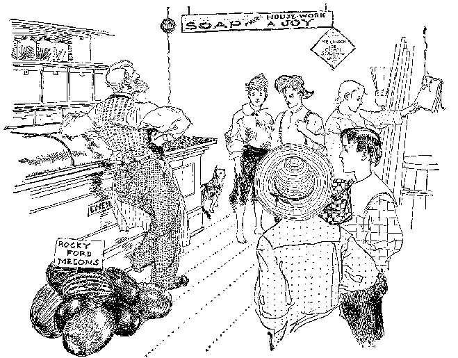 Mr. Pennington's glance at his son showed that Piggy was unharmed. A swift survey of the others gave each, save Bud, a bill of health. But when Mr. Pennington's eyes fell on Bud, he leaned on a show-case and laughed till he shook all over; for Bud, with a rimless hat upon a towselled head, with a face scratched till it looked like a railroad map, with a torn shirt that exposed a dirty shoulder and a freckled back, with trousers so badly shattered that two hands could hardly hold them together,—as Mr. Pennington expressed it, Bud looked like a second-hand boy. The simile pleased Pennington so that he renewed his laughter, and paid no heed to the chatter of the pack clamoring to tell all in one breath, the history of the incident that had led to Bud's dilapidation. Also they were drawing gloomy pictures of the appearance of his assailants, after the custom of boys in such cases. Because his son was not involved in the calamity, Piggy's father was not moved deeply by the story of the raid of the North-enders and their downfall. So he put the young gentlemen of the Court of Boyville into the back room of his grocery store, where coal-oil and molasses barrels and hams and bacon and black shadows of many mysterious things were gathered. He gave the royal party a cheese knife and a watermelon, and bade them be merry, a bidding which set the hearts of Piggy and Abe and Jimmy and Mealy to dancing, while Bud's heart, which had been sinking lower and lower into a quagmire of dread, beat on numbly and did not join the joy. As the time for going home approached, Bud shivered in his soul at the thought of meeting Miss Morgan. Not even the watermelon revived him, and when a watermelon will not help a boy his extremity is dire. Still he laughed and chatted with apparent merriment, but he knew how hollow was his laughter and what mockery was in his cheer. When the melon was eaten business took its regular order.