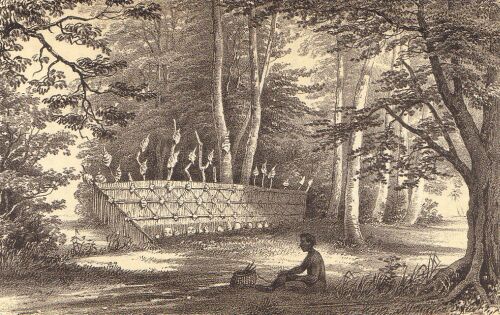 The Kowraregas returned to their island with much exultation, announcing their approach by great shouting and blowing on conchs. The heads were placed on an oven and partially cooked, when the eyes were scooped out and eaten with portions of flesh cut from the cheek;* only those, however, who had been present at the murder were allowed to partake of this; the morsel was supposed to make them more brave. A dance was then commenced, during which the heads were kicked along the ground, and the savage excitement of the dancers almost amounted to frenzy. The skulls were ultimately hung up on two cross sticks near the camp, and allowed to remain there undisturbed.