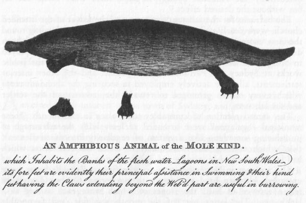 [* viz: "Although the settlement had now been established within a month of ten years, yet little had been added to the stock of natural history which had been acquired in the first year or two of its infancy. The Kangaroo, the Dog, the Opossum, the Flying Squirrel, the Kangaroo Rat, a spotted Rat, the common Rat, and the large Fox-bat (if entitled to a place in this society), made up the whole catalogue of animals that were known at this time, with the exception which must now be made of an amphibious animal, of the mole species, one of which had been lately found on the banks of a lake near the Hawkesbury. In size it was considerably larger than the land mole. The eyes were very small. The fore legs, which were shorter than the hind, were observed, at the feet, to be provided with four claws, and a membrane, or web, that spread considerably beyond them, while the feet of the hind legs were furnished, not only with this membrane or web, but with four long and sharp claws, that projected as much beyond the web, as the web projected beyond the claws of the fore feet. The tail of this animal was thick, short, and very fat; but the most extraordinary circumstance observed in its structure was, its having, instead of the mouth of an animal, the upper and lower mandibles of a duck. By these it was enabled to supply itself with food, like that bird, in muddy places, or on the banks of the lakes, in which its webbed feet enabled it to swim; while on shore its long and sharp claws were employed in burrowing; nature thus providing for it in its double or amphibious character. These little animals had been frequently noticed rising to the surface of the water, and blowing like the turtle."]