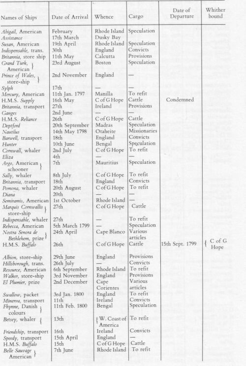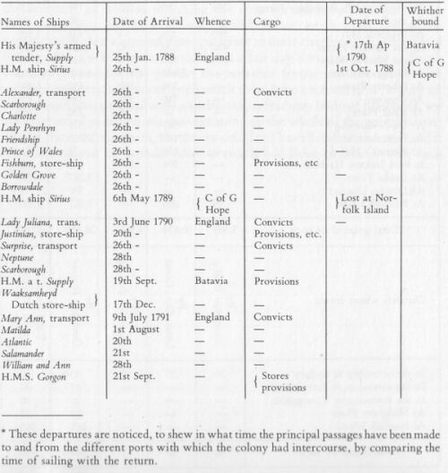 It may not be altogether uninteresting to those who may wish for information respecting the concerns of this settlement, to find a register of the shipping which has visited New South Wales from various parts of the globe; whereby it will be seen, that, in however insignificant or contemptible a point of view the colony may in general have been held, individuals have found in it either a port of refreshment after the fatigues of a long voyage, or an advantageous market for their speculations. The arrivals will be confined to the harbour of Port Jackson; only mentioning in this place that of the two ships Le Boussole and L'Astrolabe, at Botany Bay, in January 1788, under the command of the ever-to-be-regretted and unfortunate M. de la Perouse, who followed in the path of our immortal circumnavigator, Captain Cook (with whose name every writer must be proud to adorn his page), and who, like him, has left his country, indeed the whole world, to lament his loss.