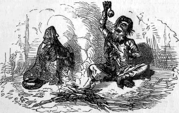 Not long after that (said old Jim Beckwourth, beginning a new story) there was a party of about a dozen of us down in the Powder River country, after buffalo. It was the worst place! Just think of the most barren and sterile spot you ever saw, or ever will see. Now take that spot and double it: that is where we were. One day, about noon, we halted near a sickly little arroyo, that was just damp enough to have deluded some feeble bunches of [pg 210] bonnet-wire into setting up as grass along its banks. After picketing the horses and pack-mules we took luncheon, and then, while the others smoked and played cards for half-dollars, I took my rifle and strolled off into the hills to see if I could find a blind rabbit, or a lame antelope, that had been unable to leave the country. As I went on I heard, at intervals of about a quarter of an hour, a strange throbbing sound, as of smothered thunder, which grew more distinct as I advanced. Presently I came upon a lake of near a mile in diameter, and almost circular. It was as calm and even as a mirror, but I could see by a light steamy haze above it that the water was nearly at boiling heat—a not very uncommon circumstance in that region. While I looked, big bubbles began to rise to the surface, chase one another about, and burst; and suddenly, without any other preliminary movement, there occurred the most awful and astounding event that (with a single exception) it has ever been my lot to witness! I stood rooted to the spot with horror, and when it was all over, and again the lake lay smiling placidly before me, I silently thanked Heaven I had been standing at some distance from the deceitful pool. In a quarter of an hour the frightful scene was repeated, preceded as before by the rising and bursting of bubbles, and producing in me the utmost terror; but after seeing it three or four times I became calm. Then I went back to camp, and told the boys there was a tolerably interesting pond near by, if they cared for such things.