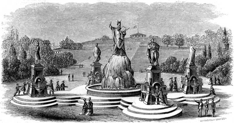 Water, the simplest, most healthful and most indispensable of all refreshments, is provided without stint and without price. Foreigners are struck with the immense consumption of water as a beverage in this country. They do not realize the aridity of our summer climate, which makes it sometimes as much of a luxury here as it is in the desert. A rill of living water, let it issue from a mossy rift in the hillside or the mouth of a bronze lion, comes to us often like the shadow of a great rock in a weary land. We lead fevered lives, too, and this is the natural relief. Fountains are among the first decorations that show themselves in public or private grounds. They give an excuse and a foothold for sculpture, and thus open the way for high art. In the Centennial grounds and in all the buildings upon them, of whatever character, the fountain, in more or less pretentious style, plays its part. Led from the bosom of a thousand hills, drawn from under the foot of the fawn and the breast of the summer-duck, it springs up into the midst of this hurly-burly of human toil and pleasure, the one unartificial thing there, pure and pellucid as when hidden in its mother rock.