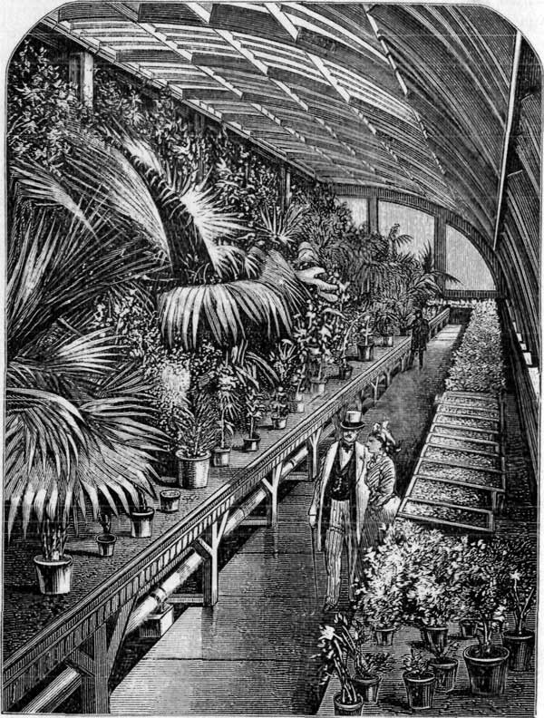 The manufacture of a torrid climate on so large a scale will strike the visitor as one of the most curious triumphs of ingenuity in the whole exposition. Moisture is an essential only second in importance to heat. The two must be associated to create the normal atmosphere of most of the vegetation of the central zone. Art, in securing that end, reverses the process of Nature. The heat here is supplied from below and moisture from [pg 538] above, thus transposing the sun and the swamp. In summer, indeed, the sun of our locality, reinforced by glass, will as a rule furnish an ample supply of warmth. Very frequently it will be in excess, and allow the imprisoned strangers the luxury of all the fresh air they can crave. Our summer climate is in this way more favorable than that of Kew, which in turn has the advantage in winter. The inferior amount of light throughout the year and the long nights of winter in a high latitude again operate against the English horticulturists, and leave, altogether, a balance in our favor which ought to make the leading American conservatory the most successful in the world.