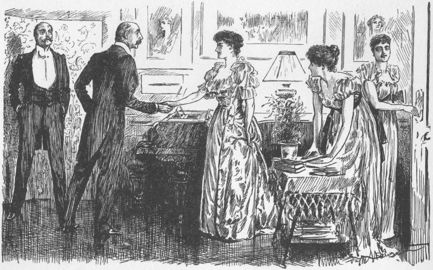 This is the conversation in the hall between two ladies leaving a party in one of du Maurier's most characteristic drawings. On every side there are footmen and a crowd of guests cloaking and departing. Of Mrs. Ponsonby de Tomkyns Mr. Henry James has said: "This lady is a real creation.... She is not one of the heroines of the æsthetic movement, though we may be sure she dabbles in that movement so far as it pays to do so. Mrs. Ponsonby de Tomkyns is a little of everything, in so far as anything pays. She is always on the look-out; she never misses an opportunity. She is not a specialist, for that cuts off too many opportunities, and the æsthetic people have the tort as the French say, to be specialists. No, Mrs. Ponsonby de Tomkyns is—what shall we call her?—well, she is the modern social spirit. She is prepared for everything; she is ready to take advantage of everything; she would invite Mr. Bradlaugh to dinner if she thought the Duchess would come to meet him. The Duchess is her great achievement—she never lets go of her Duchess. She is young, very nice-looking, slim, graceful, indefatigable. She tires poor Ponsonby completely out; she can keep going for hours after poor Ponsonby is reduced to stupefaction. This unfortunate husband is indeed almost stupefied. He is not, like his wife, a person of imagination. She leaves him far behind, though he is so inconvertible that if she were a less superior person he would have been a sad encumbrance. He always figures in the corner of the scenes in which she distinguishes herself, separated from her by something like the gulf that separated Caliban from Ariel. He has his hands in his pockets, his head poked forward; what is going on is quite beyond his comprehension. He vaguely wonders what his wife will do next; her manoeuvres quite transcend him. Mrs. Ponsonby de Tomkyns always succeeds. She is never at fault; she is as quick as the instinct of self-preservation. She is the little London lady who is determined to be a greater one—she pushes, gently but firmly—always pushes. At last she arrives."