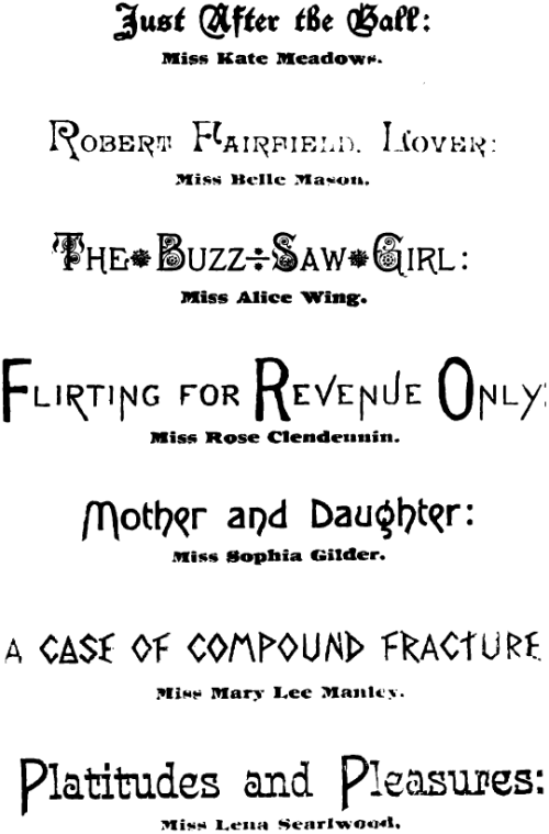 I am almost engaged! Even Aunt Patsey likes the man, and O, so do I! He is nice and quiet, and just loves to hear me talk—never interrupts me, but lets me go on, and looks at me so admiring-like all the time! Ma says I am sure to spoil every thing by too much talking! He is so timid! I encourage him, though, all I can; he seems to like encouragement so much! He understands and appreciates me, too, and that is a great deal; for most of the other men act so funny when they are left alone with me! They nearly always have a solemn, almost scared look—but I really don't know why! I must confess that I like stupid men; they may not talk much, yet they seem real eager to listen! Then stupid men always have such good manners, which, in society, counts for a great deal! People who have good manners are so safe—they never do any thing startling! I wish my manners were better—but they are not! After one of Aunt Patsey's talks on good form, and strict propriety, I try to improve—regenerate, if possible. I often watch Miss Lena Searlwood, one of the older girls, who is a great favorite with Aunt Patsey—but it is no use! She is a self-contained woman, never ill at ease, and who puts you, and at once, at rights with yourself. She is a most beautiful and discreet talker! She would rather die, burn at the stake, suffer on the rack, than tell even the suspicion of a family secret! Aunt Patsey is always talking her up to me, wishing that I would be only a little bit like her anyhow. So the other night, at a party, I took special care to notice the attractive Lena. She is so graceful; quiet grace, ma calls it. She leaned against a heavy, carved chimney-piece, with dark-red plush hangings, and she looked for all the world just like a tall, white flower, slender, beautiful! She was slowly picking to pieces, leaf by leaf, a pale-pink rose, which she had stolen away from somewhere about her willowy, white throat. And while she was doing all this—and it took quite a while, too—she looked full in the face of the man by her side, that rather good-looking, stuck-up Calburt Young, and said nothing—absolutely not a word! She did this long enough to make me almost lose my breath. I could not do a thing like that; it would give me nervous prostration sure! Yet, I know it is very effective! It was just like some picture you read about, and it was beautiful, striking, down to the smallest detail. But situations effective, and details pleasing, are not in my line, and they are just as much a mystery as improper fractions used to be when I was a schoolgirl. I hated my school! It was called a "Young Ladies' Seminary." It was a fashionable, intellectual hot-house, where premature, fleeting blooms were cultivated regardless of any future consequence. But I was a barren bush! I never fashion-flowered into a profusion of showy blossoms. Aunt Patsey said that I did not reap the harvest of my golden opportunities; but pa, he growled and grumbled a good deal when the bills came pouring in, but paid them, and roundly swore that he was glad he had no more fool-daughters to finish off in a fashionable seminary.