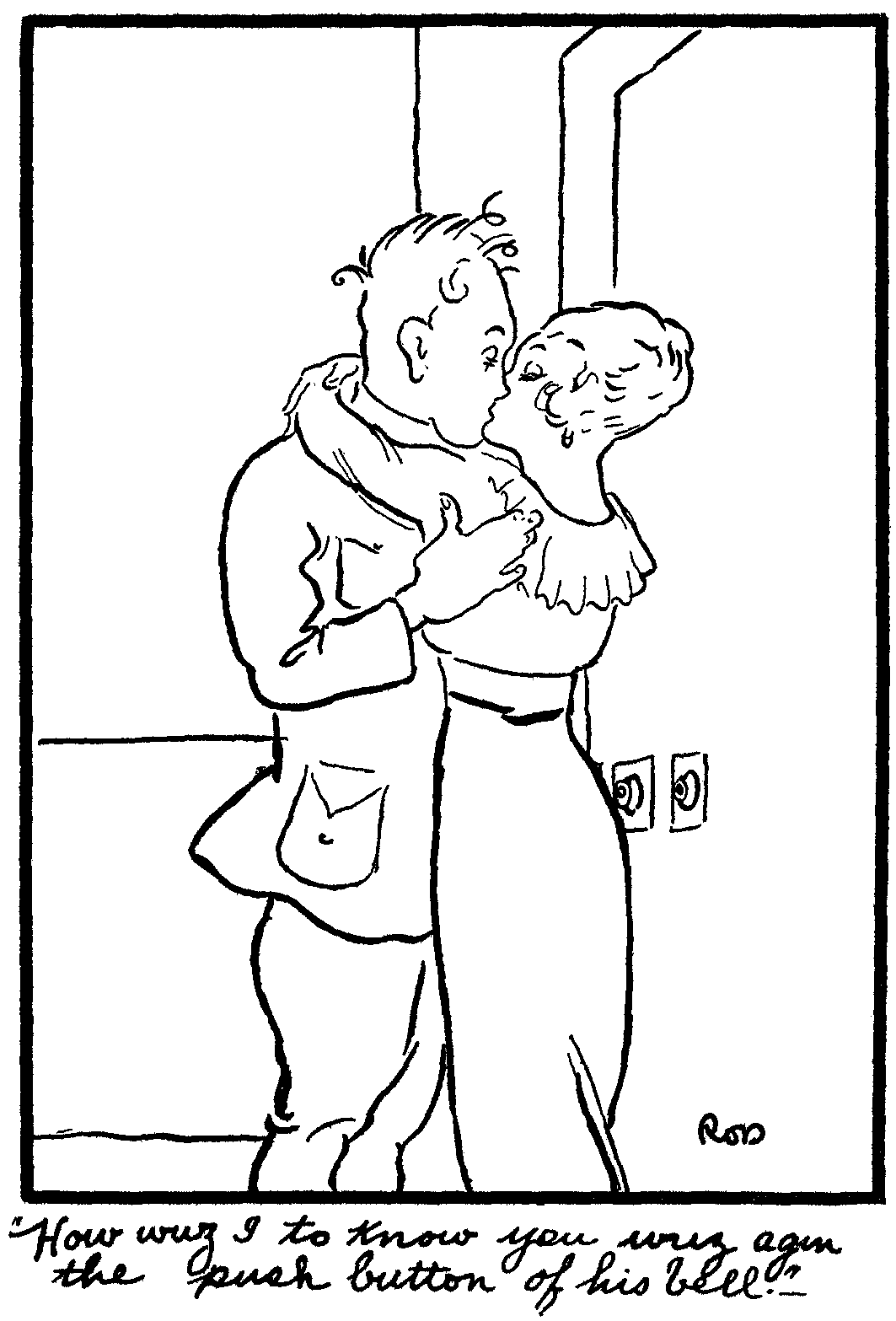 The most vivid impression in my bean is our interview in the hall-way of your flat the night (or was it morning) when we bid each other a fond fare-thee-well. Never will I forget them tender and loving words you spoke, also will I remember them words spoke, by the guy on the second floor, NOT so tender; how was we to know you were backed up against the push button of his bell? When a boob like him lives in a flat in wartime he ought to be made to muffle his bell after 10 p.m. I'm gonna rite the Pres. about this.