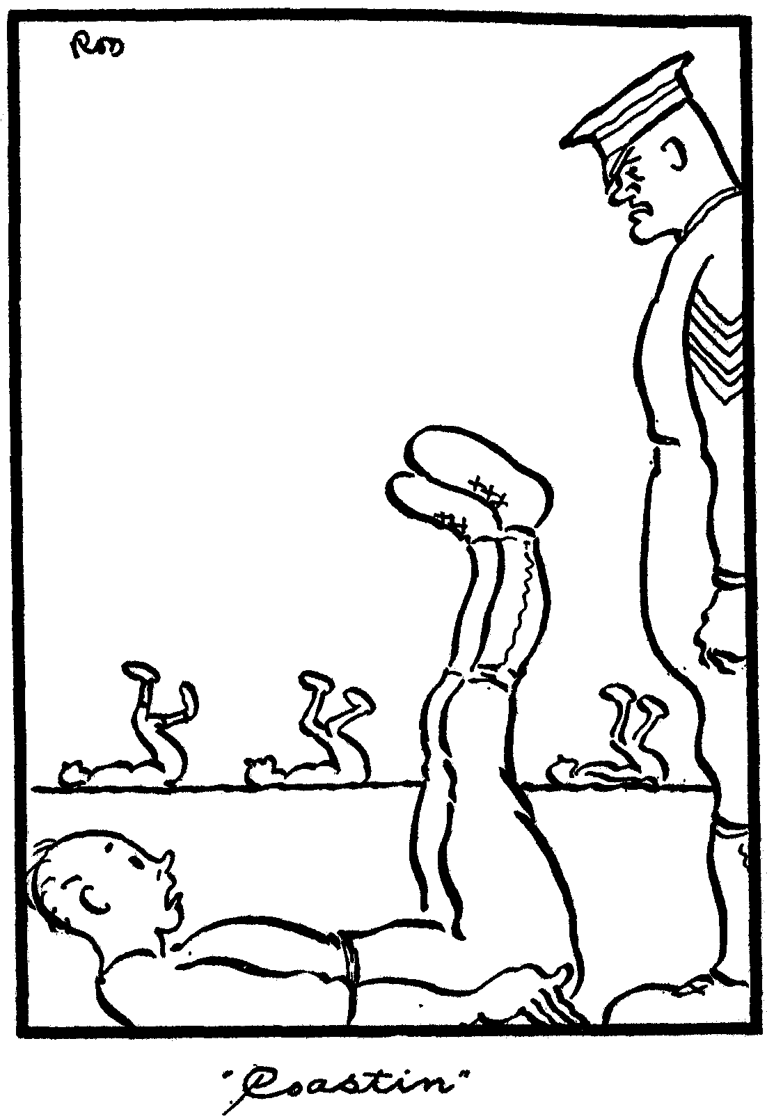 We got our first settin up exercises today. Believe you me, they are more settin down than they are settin up. All the boobs have to lie on there backs, put there laigs in the air, and move 'em like he wuz ridin a bicycle. All to once Skinny Shaner stopped. The drill Sarge stepped over and deemanded to know why he quit. "Im coastin" pipes Skinny, "I always do a little coastin when I ride a wheel." Believe you me if Skinny ever tries to ride all of them wheels in his head at one and the same time, he have to do a considerable lot of coastin. With love and mushes,