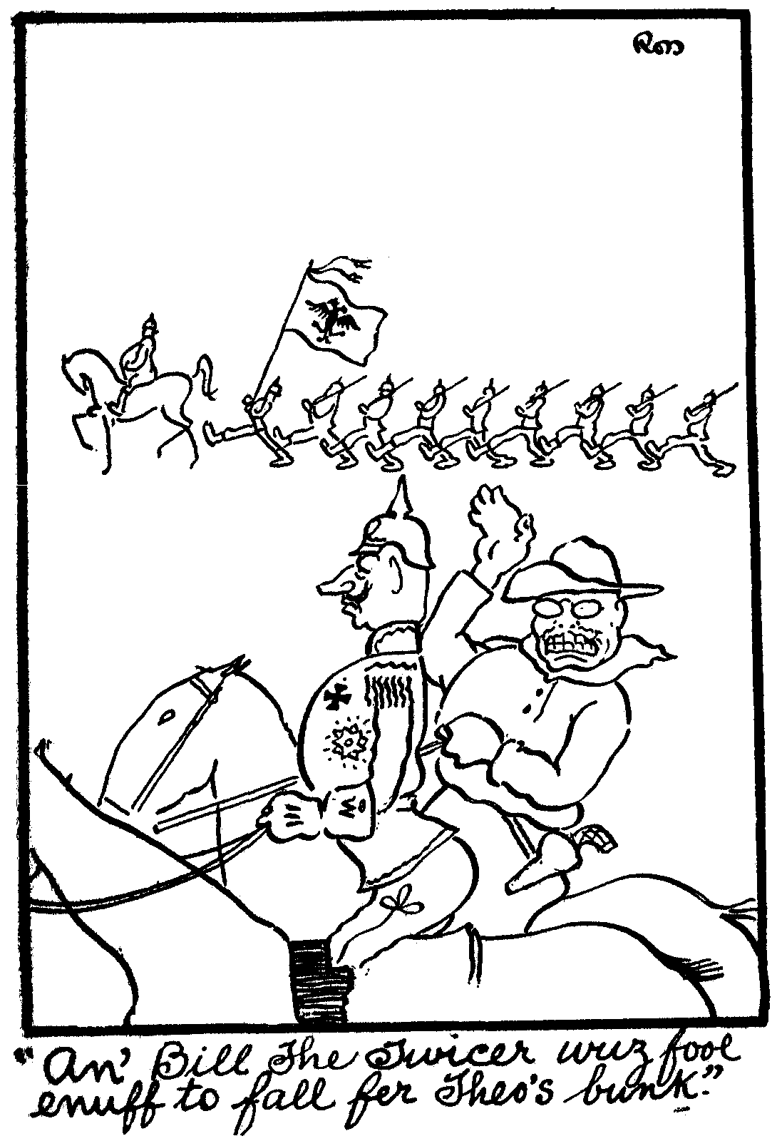 Well, deary, far be it from me to say how long this war will last. I got a scheme to end it, so I'm gonna spill it to you, and here she is; Lock Theo. Roosevelt and his three sons in the same room with William the Twicer and his seven sons; whichever cums out at the end of an hour wins the war. You bet when this cums off I'll hold a ticket on Theo. Well honey bunch, I had a lovely dream last eve, I dreamed that you and me was holding down a park bench, with not a cop in sight. I had just taken you in my arms, and touched your ruby lips, when I suddently awoke to find the captain's pet sausage hound was licking my nose. Some day there's gonna be a first class dog funeral in this camp and that lop-eared canine is gonna ride in the head wagon.