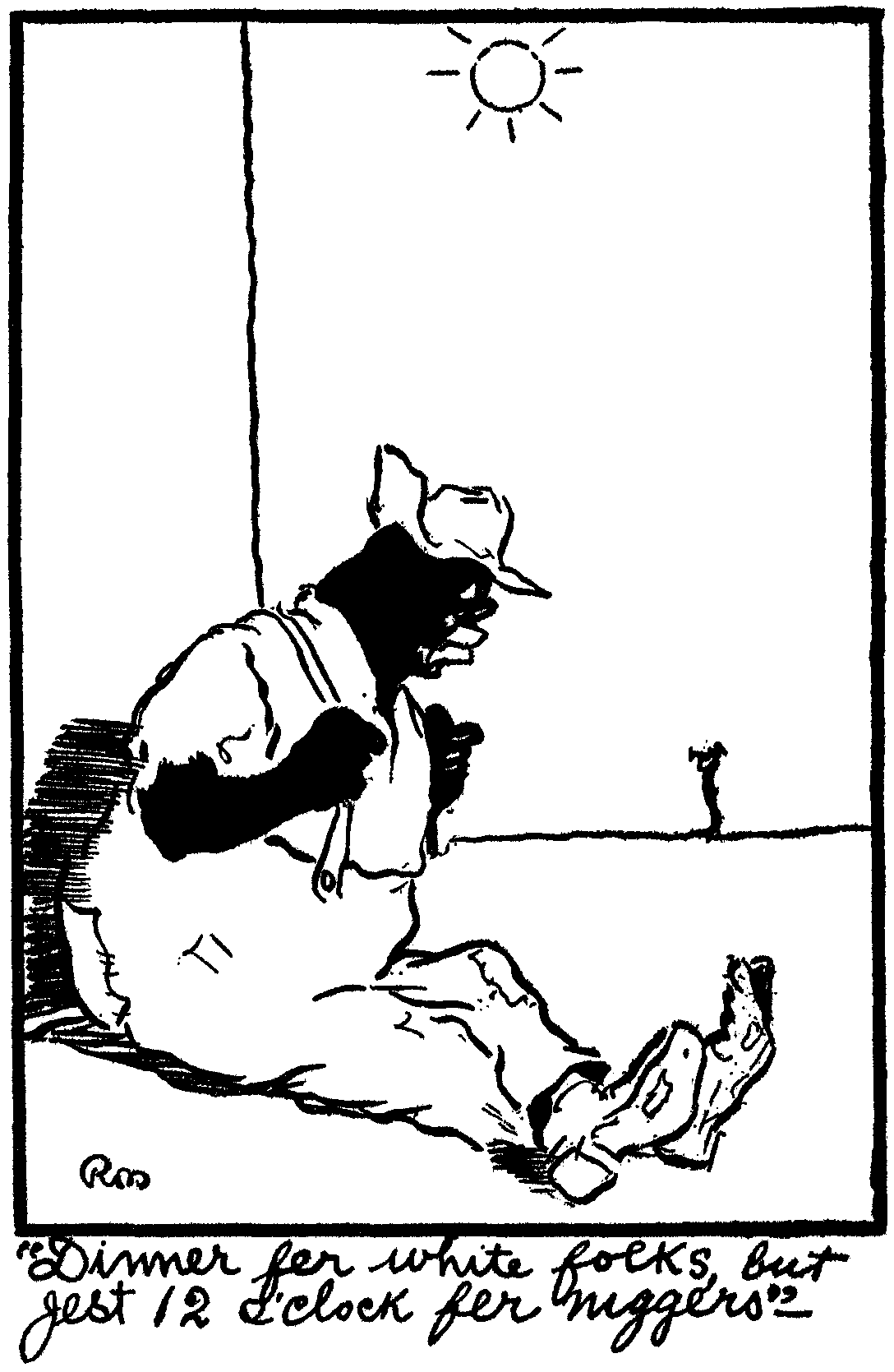Well, ol' girl, you can see by the heading of this that we have gone south. The plentifullest things down here is "dinges", mules and mud, and you very seldom see one without the other. You know Julie "Birds of a fether gathers no moss"; sumpin like that anyhow; you know Julie I was never much on problems. I see a big lazy dinge yesterday asleep against a corner of the barracks when the bugle blowed the mess call; he woke up in time to hear the last notes; stretching himself and scratching his bed, he said: "Dar she blows, dinner time for white folks, but just 12 o'clock for niggers."