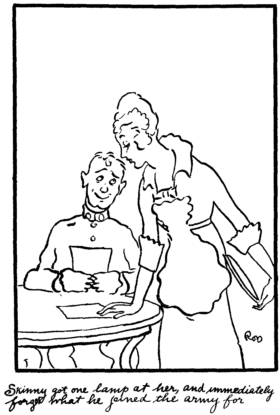 We wuz a little nervous account of not being wise to the customs, but Skinny said if we kept our lids down over our ears nobody would be wise as to what was going on inside our skulls. The first place we went into was the Palm Tree Inn. All the barkeepers and waiters was "Janes." Most of them wuz pretty good looking; one "Jane" in particular was there with a front. Skinny got one lamp at her and immediately forgot what he joined the army for.