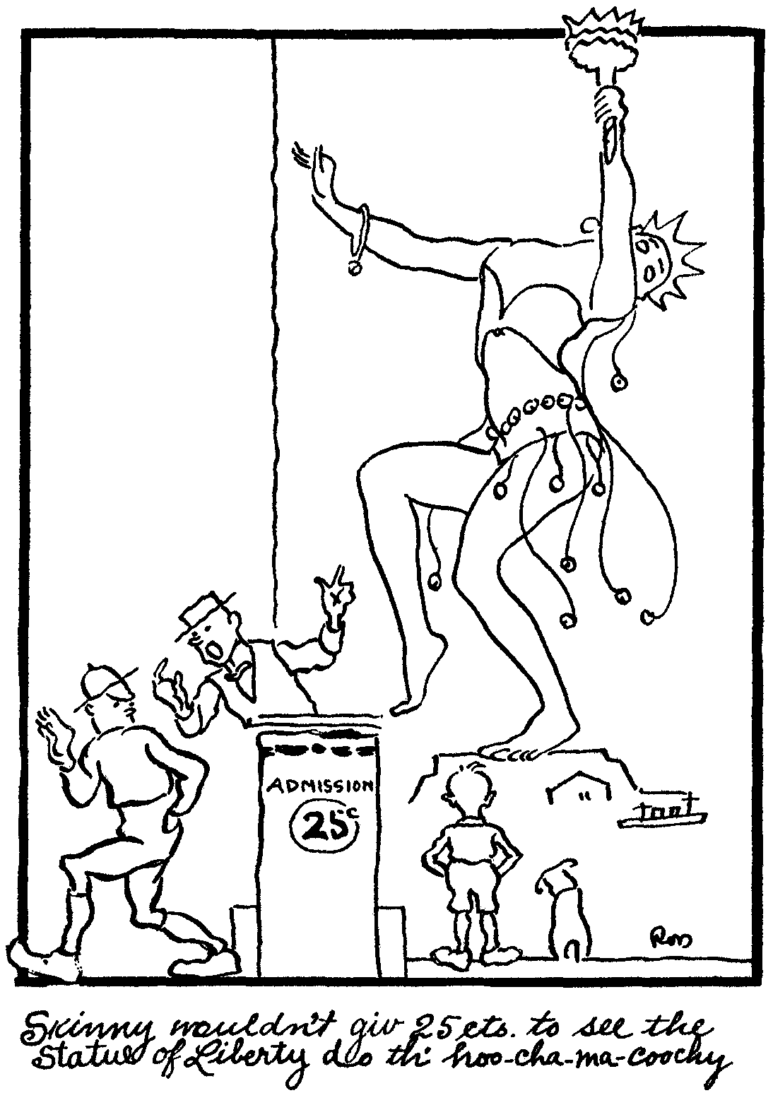 If there's one thing in life that Skinny loves its sumpin good to eat. Honestly, Julie, I believe he thinks of eating when he's asleep. We goes into a feedin place yesterday in White Chapel to satisfy what the poets call, an inner longing. I was so hungry my stomak tho't my throat was cut, Skinny slips the female "biscuit shooter" a tip and sez, "Now suggest a good dinner for me;" and she whispered in his listener "Go to some other restaurant." Serves Skinny right about losing the tip for he's such a tight wad that when the company sings "Old Hundred" at chapel Skinny sings the "Ninety and Nine" just to save a cent. Honest Julie, I don't believe he would give two bits to see the statue of Liberty do the hoo-chama-cooch. Speaking of the hoochy-koochy reminds me that we saw the Ol' Curiosity shop that Charlie Dickens wrote about, and desiring to become acquainted with how much Skinny knowed about books, plays, and etcetery, I asked him did he ever see Oliver Twist? He says "no but I've seen Fatima wiggle." He would miss a point if he sat down on a tack, and it would take a vaccum cleaner to sweep the cob-webs from his noodle; someday I'm gonna hang a peece of crape on his nose, for I think his brain is dead.