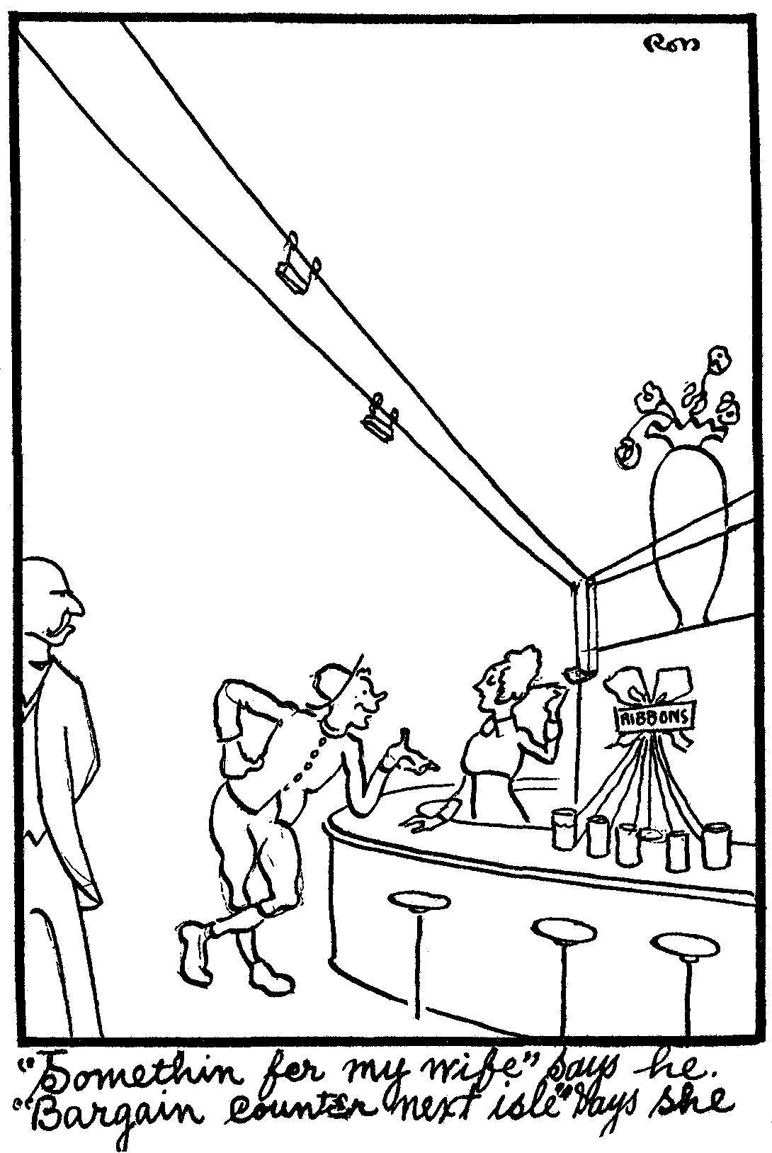 Skinny went into store today to buy a birthday present for his "Jane" in the U.S. Steppin blithely up to a fresh sales girl he said "I wanna get something for a gift to a lady." "Your wife sir?" sed she. Skinny thought it would be safer to pose as a married man, so he said "Yes'm." "Bargain counter to the right, sir," and she went on wrasslin with her Wrigleys; she was so busy with it, she wasted no more time than a blue gum coon passing a grave yard at midnight, with no rabbits foot in his pocket. The sales ladies in this emporium are always in high speed, with the throttle wide open when it comes to chatter; at another counter I asked the young lady to show me the thinnest thing in underwear. Flashing a 40 below zero look she lisped, "I'm very sorry sir, but she's just gone out to lunch."