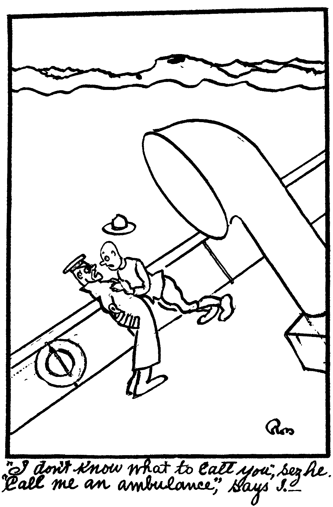 Believe you me, Julie, I luv a life on the ocean wave like a burlecue soubrette luvs an alarm clock; that is I like it a lot, but not a heluva lot. Fer four hours at a strech I leand over the side of the ship; I wuzn't interested in the ocean or the study of fishes, only I felt I had sumpin I must give up. Finally, after givin up everything, even standin for some of Skinny's jokes, I managed to recover sufficient to enjoy two meals before we got to the dock. Believe you me, derie, you do not know how near you cum to havin to wear black, and cashin in on my life insurance. Speaking of life insurance, reminds me of Skinny's prayer when he turned in one night when it was stormy. "Now I lay me down to sleep, I pray the Lord my soul to keep, If the ship should sink before I wake, Uncle Sam has made a $10,000 mistake."