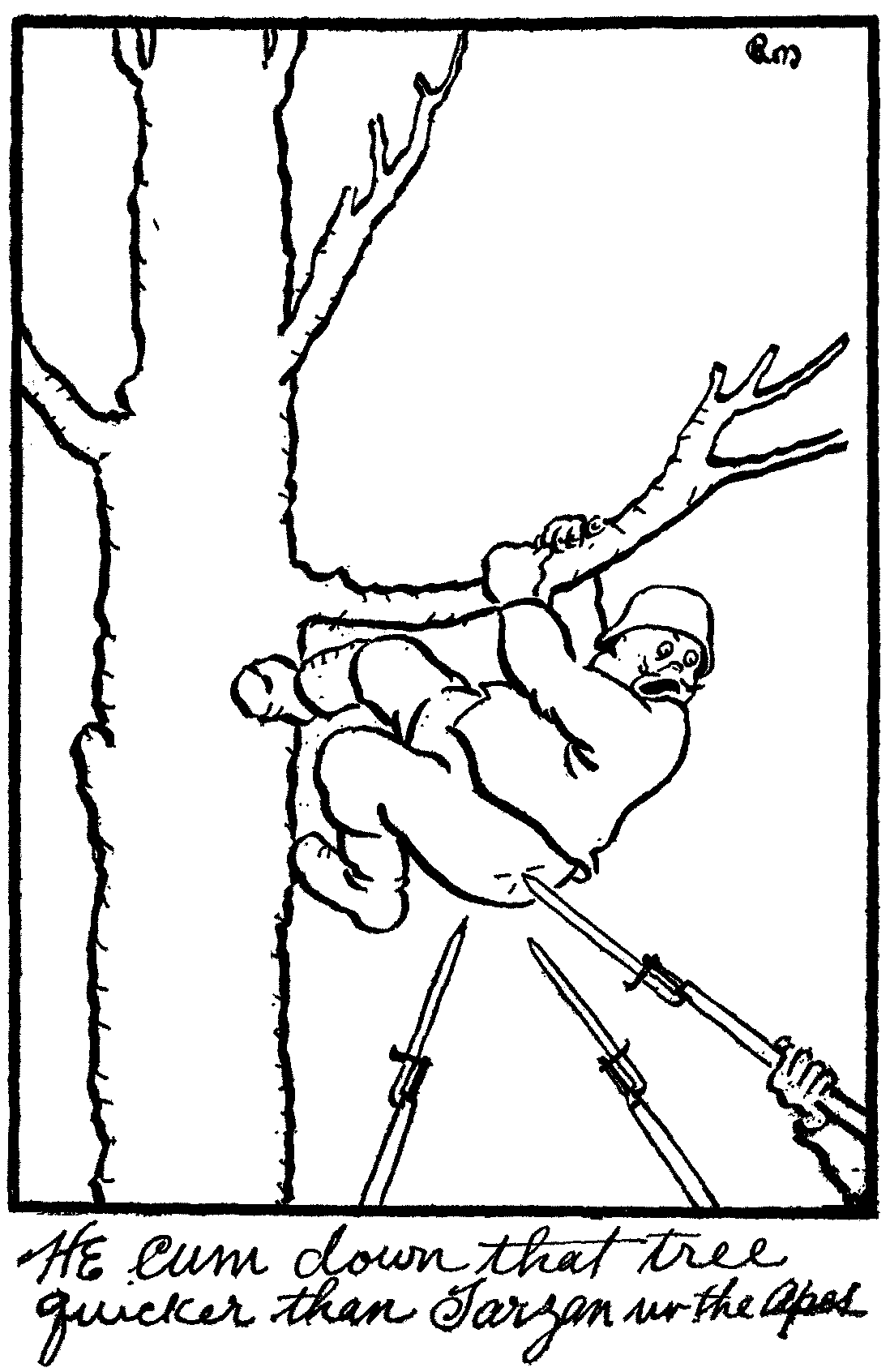 Believe you me derie, the way our boys made that sniper climb down out of that tree would make Tarzan of the apes have a hemorage, and turn green with envy; he shinned down that landscape decorashun like as if it was greased.