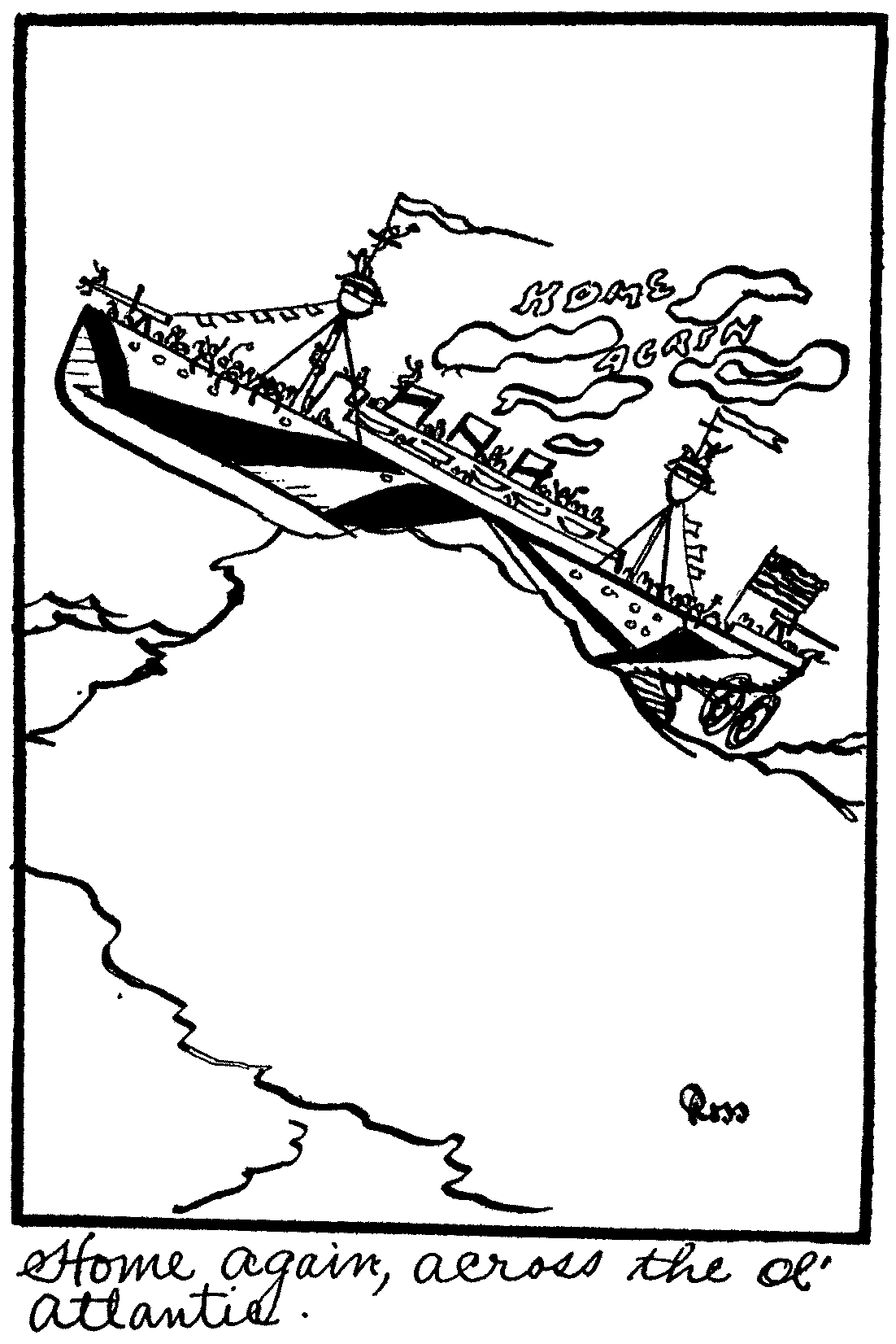 Well derie, I don't suppose an other letter will reach you before "Yours truly" so I can't say if I will rite again or not; enny-ways on our way back across the ol' Atlantic we wont have to look out fer any of William the Twicers tin fish, and when I get back to the land of the free and the home of the brave, I'm gonna be afraid to get on a ferry boat fer fear she might head across the ocean. And now Julie, fare-thee-well until I hold you in my arms again,