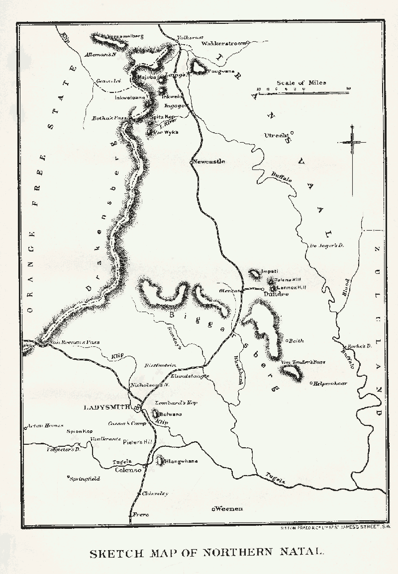 This hypothetical appreciation probably represents the general opinion current both at home and abroad during the period immediately preceding the outbreak of the War; but it proved to be mistaken from the first. The Free Staters joined the Transvaalers and the allied forces assumed the offensive over a wide area without delay. Kimberley and Mafeking were threatened on the west, and on the east the Boers poured into Natal, upon which they had for sixty years looked with the aggrieved and greedy eyes of a dog {8} from whom a bone, to which he believes he is entitled, has been recovered.