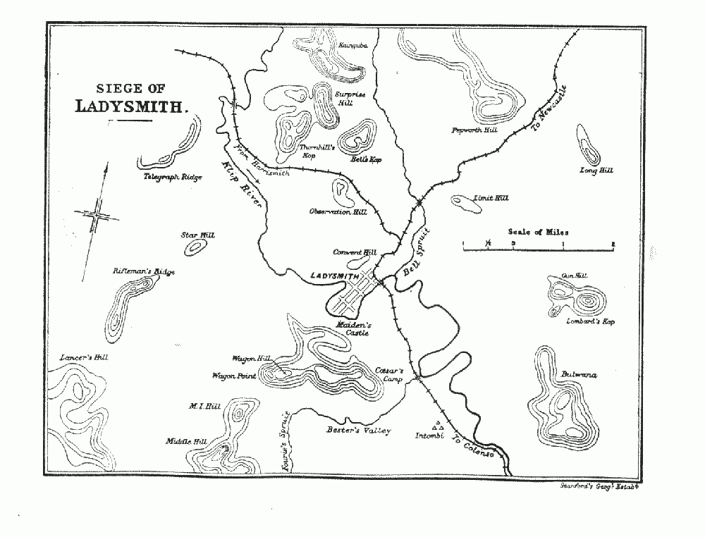 Sometimes a cause can be found a posteriori by groping in the dim and deceptive light cast by an effect: or a process of exhaustion and elimination may be set up in which the qualities common to each side are cancelled and the result attributed to the credit balance which will appear under one of the accounts. We saw for some months a gallant and well equipped if somewhat amorphous British Army impotently endeavouring, though in superior numbers, to make headway against an aggregation of Boer commandos, and checked at various points on an arc drawn wholly in British territory and extending in a circuit of over 500 miles from Ladysmith in Northern Natal through Stormberg and Colesberg to Kimberley and Mafeking; and at each extremity of the arc was a besieged city. Was the military art as taught in Europe founded upon error, or had the British Army been negligently instructed in it?