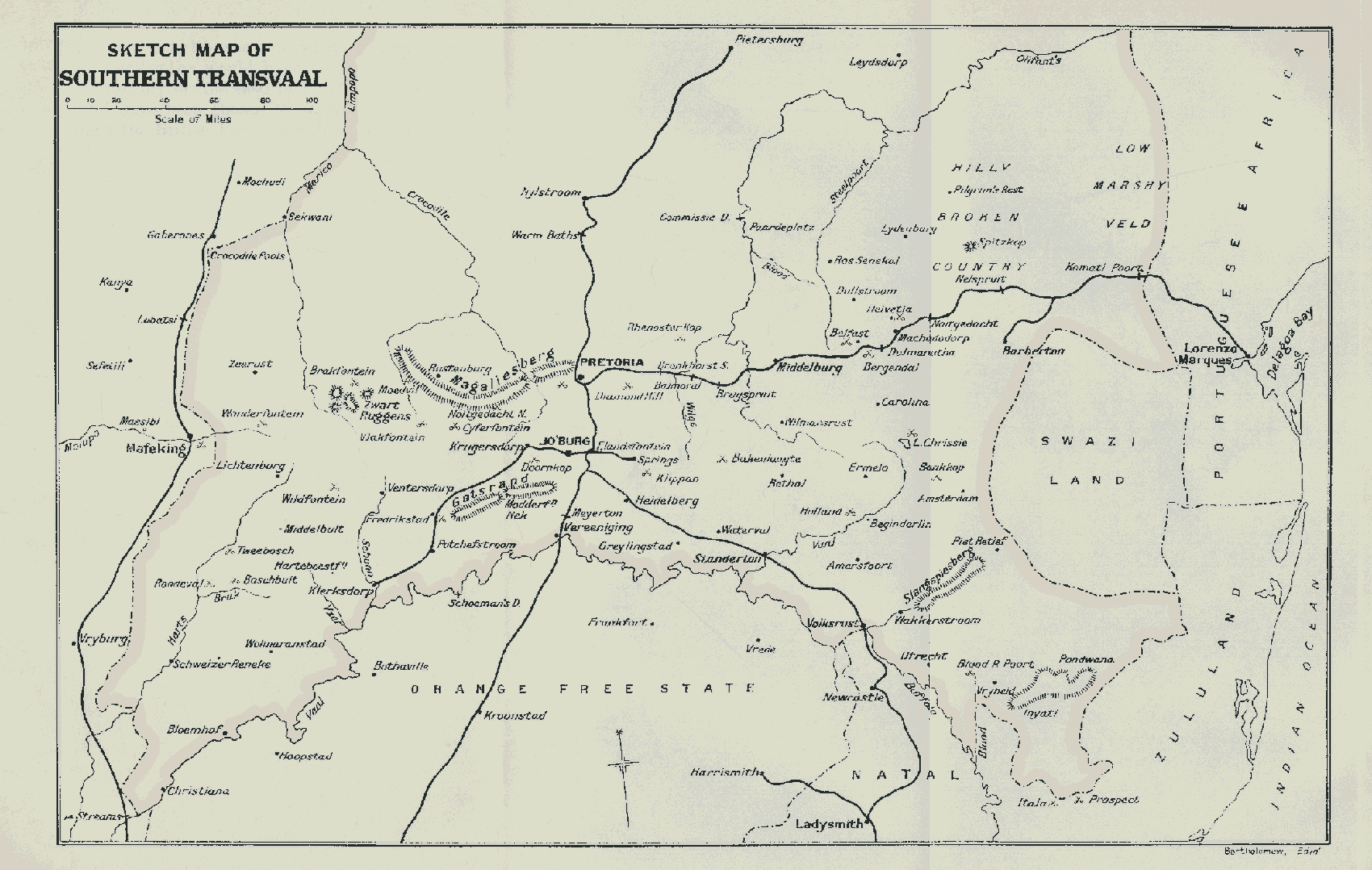 The voortrekkers, among whom was the boy Paul Kruger, slowly passed away towards the north and crossed the Orange River. Moshesh, the chief of the Basutos, watched curiously from his mountains the trains of wagons strung out on the veld, but refrained from molesting the emigrants. Not so Moselekatse,5 a chief who had formerly broken away from Chaka and had set himself up beyond the Vaal, and who subsequently founded the Matabele Kingdom in which he was succeeded by his son Lobengula. He swooped down upon the advanced parties, who defended themselves with success and afterwards chastised him in his own country, in which, hidden from his eyes, lay the gold-bearing reefs of Johannesburg.