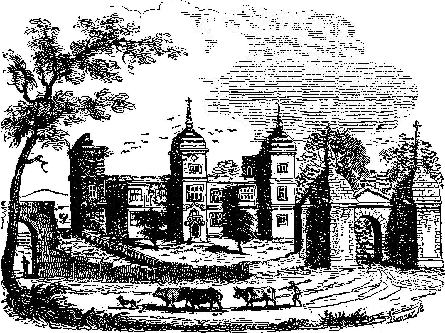 Brambletye, or, as it is termed in Doomsday Book, Brambertie House, after the conquest, became the property of the Earl of Mortain and Cornwall, forming part of the barony then conferred upon him, and subsequently denominated the honour of the eagle. Passing into possession of the Andehams, Saint Clares, and several others, it came into the occupation of the Comptons, towards the beginning of the seventeenth century; and from the arms of that family impaling those of Spencer, still remaining over the principal entrance, with the date 1631 in a lozenge, it is conjectured that the old [pg 266] moated edifice (represented in the annexed vignette) which had hitherto been the residence of the proprietors, was abandoned in the reign of James I., by Sir Henry Compton, who built the extensive and solid baronial mansion, commonly known by the name of Brambletye House.