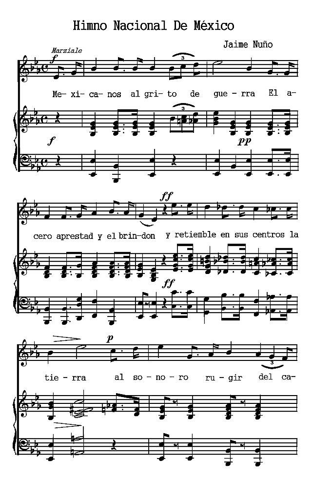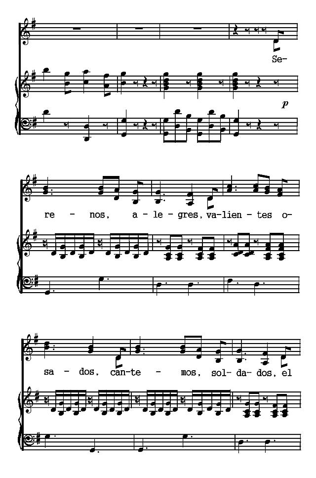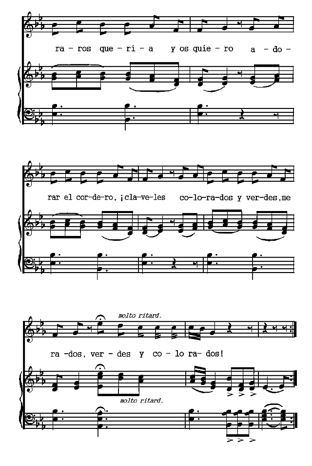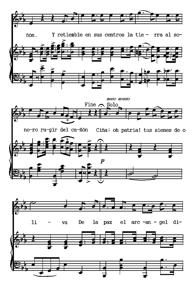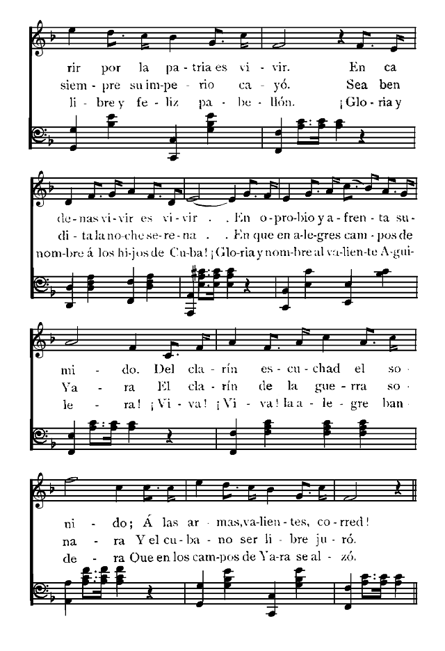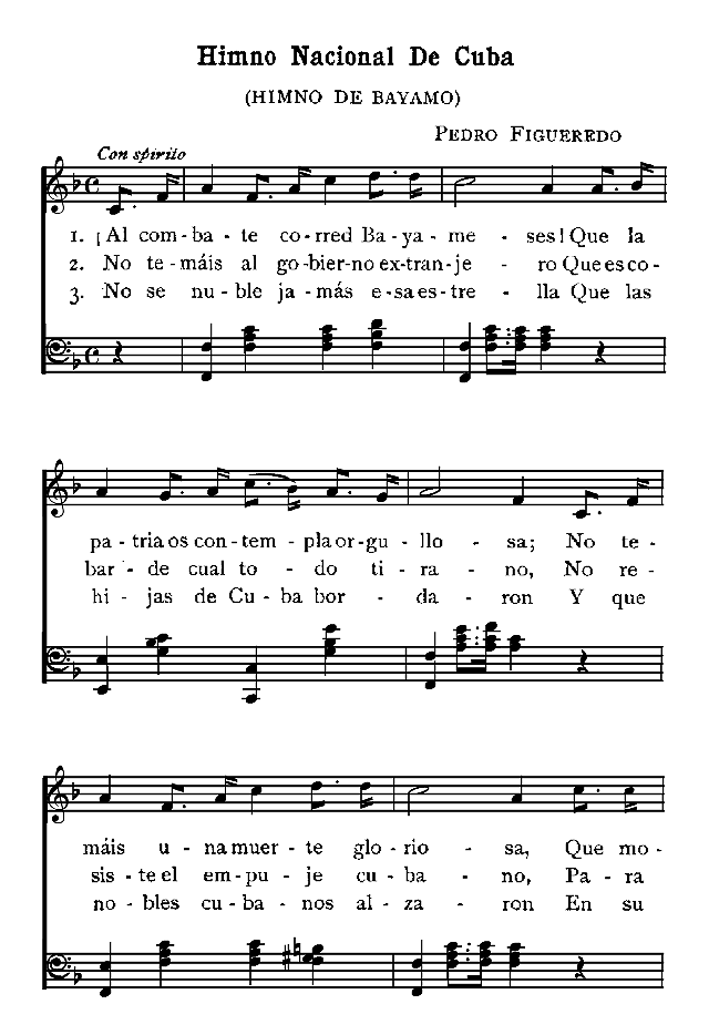 251.—Himno Nacional de Cuba, called also the Himno de Bayamo, on account of the importance of Bayamo (see in Vocab.) in the Cuban revolution of 1868. Note the ternary movement of this song, and see Versification, p. lxxiii.