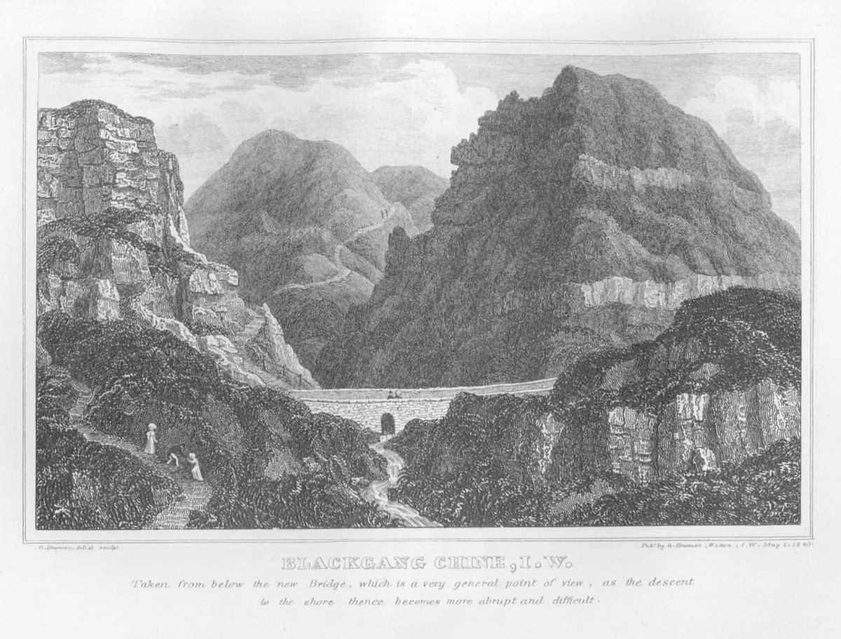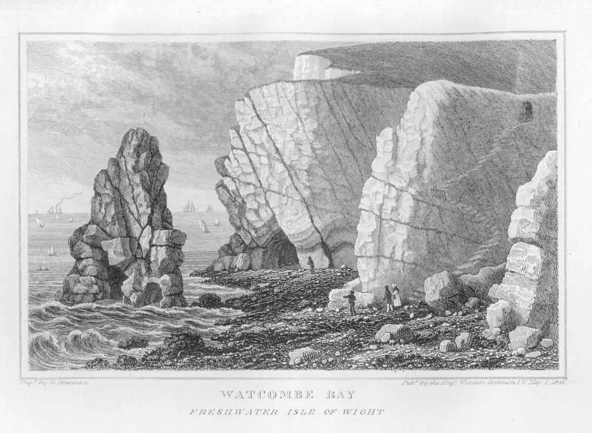 That part of the island immediately opposite Hampshire is generally well-wooded, with an easy descent to the shore—populous and busy, as might be expected from the two considerable watering-places before named, and several excellent harbors. But the south side (familiarly called the Back of the Island,) being washed by the impetuous tides of the ocean, presents a very different aspect, showing the resistless progress of the waves:—and hence perpendicular cliffs of great altitude, precipitous slopes constantly detaching large masses of earth and rocks, and all the picturesque confusion produced by successive landslips: here therefore the scenery is variously characterized by dreary devastation, romantic beauty, or sublime splendor of effect. But not so of the Interior of the island, which presents the softer pictures of pastoral and rural life: for ...