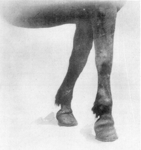 Symptomatology.—Wounds inflicted by striking the extremities in this manner present various appearances and occasion dissimilar manifestations. The hind legs are almost as frequently affected as the front and the fetlock region is most often injured, though wounds may be inflicted to the coronet. In front, the carpus is sometimes the site of injury.