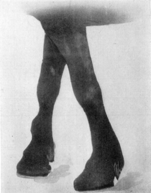 Treatment.—Subjects are best put in slings and kept so confined until regeneration of tendinous structures has been completed. This requires from six weeks to two months' time. In addition, the extremity is kept in a state of extension by means of suitable splints and shoes,—a shoe equipped with an extension at the toe and perforated so that a steel brace may be hooked into the perforation and the brace fashioned to be buckled to the upper metatarsal region. When braces are placed in front of the foot, great care is necessary in properly padding the member with cotton lest sloughing from pressure occurs at the coronet; but this does not apply in rupture of extensors so much as where flexors are ruptured.