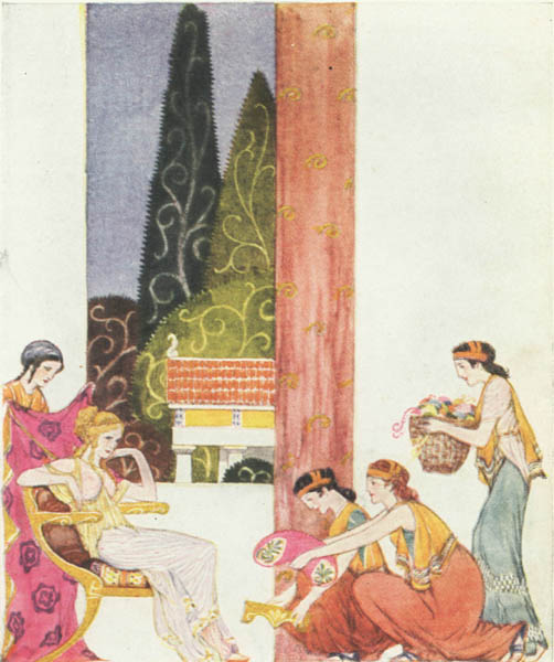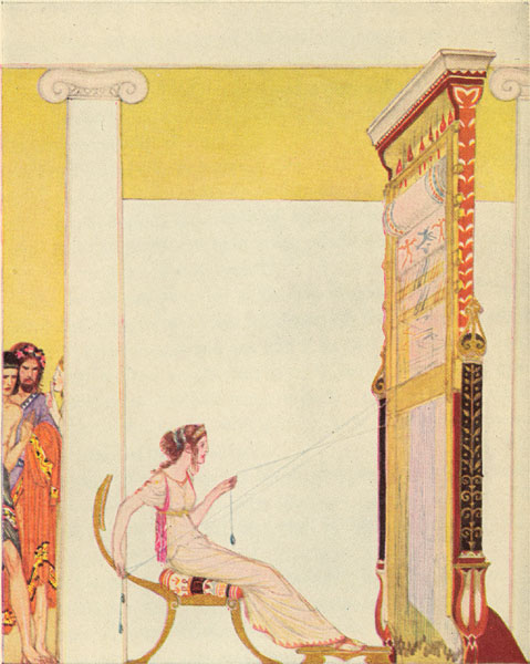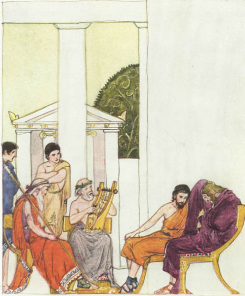 Phemius came and the wooers called upon him to sing them a tale. And the minstrel, in flowing verse, began the tale of the return of the Kings and Princes from Troy, and of how some god or goddess put a trouble upon them as they left the City they had taken. And as the minstrel began the tale, Penelope, Telemachus' lady-mother, was coming down the stairs with two hand-maids beside her. She heard the words he sang, and she stood still in her grief and drew her veil across her face. 'O Phemius,' she cried, 'cease from that story that ever wastes my heart—the story that has brought me sorrow and that leaves me comfortless all my days! O Phemius, do you not know other tales of men and gods that you might sing in this hall for the delight of my noble wooers?'