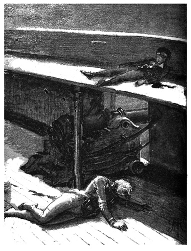 No pudo hablar más. Yo me agarré fuertemente al cuerpo de Medio-hombre. Un violento golpe de mar sacudió la proa del navío, y sentí el azote del agua sobre mi espalda. Cerré los ojos y pensé en Dios. En el mismo instante perdí toda sensación, y no supe lo que ocurrió.