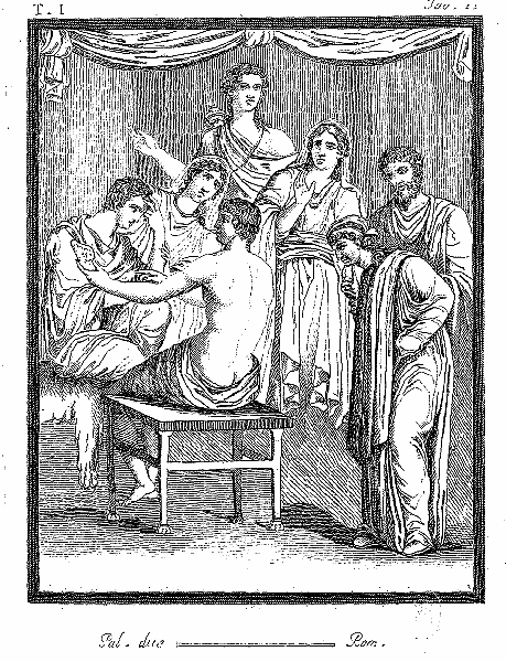 Les opinions ont beaucoup varié dans l'explication de cette peinture trouvée dans les fouilles de Résine en 1740. Est-ce le dévouement d'Alceste, ou l'entrevue de ces frères implacables, Ethéocle et Polinice, ou le jugement d'Oreste dans l'Aréopage? Nous pencherons plutôt à voir ici la belle scène de la reconnaissance d'Oreste dans l'Iphigénie en Tauride d'Euripide. Nous retrouvons Oreste dans le jeune homme sombre et pensif, assis sur un siége couvert de la peau d'un animal; cette vierge qui pleure en l'embrassant, exprime avec vérité sa soeur Iphigénie à l'instant ou elle le reconnaît; le jeune homme assis devant lui, tenant une feuille déroulée, et qui paraît, en la lisant, désigner Oreste, sera son ami Pilade. Il nomme à la prétresse ce même frère auquel il devait remettre sa lettre; la jeune fille et la vieille peuvent représenter le choeur qui promet le silence; le vieillard, frappé d'étonnement, sera le roi Thoas; enfin, la statue revêtue d'une chlamyde avec le carquois suspendu à l'épaule, sera celle de Diane, que les fugitifs devaient enlever.