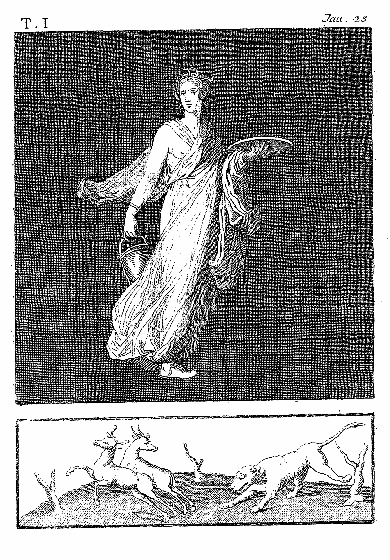 Le Génie de la Chasse ne peut être représenté avec plus de vie, avec plus de grâce. Il tient deux javelots de la main gauche; de l'autre, il lance le trait qui va percer l'un des cerfs fugitifs; le battement de ses aîles et sa draperie flottante répondent à la vivacité de son action. Les cerfs sont d'une belle forme et s'élancent avec rapidité. Les chiens sont tels que les décrit un auteur ancien (NEMESIANUS, v. 108 et suiv.) «Elevés sur les jambes, la poitrine large, les flancs effilés vers la croupe, la queue recourbée et les oreilles flottant avec souplesse dans leur course». Le peintre n'a rien négligé pour exprimer cet exercice chéri des rois et des héros, et qui préparait les Romains la gloire, en développant leurs forces et en entretenant leurs membres dans la vigueur. (Voy. HOR. I, ép. XVIII).