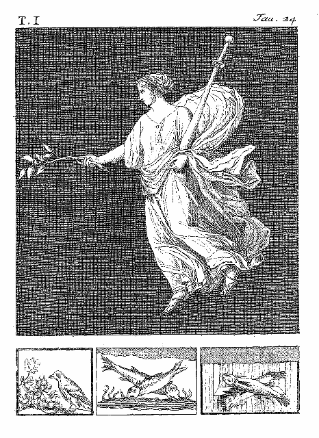 Quelle est cette gracieuse figure? La blancheur de son vêtement, la candeur qui règne dans ses traits, ont fait croire qu'elle représentait la Paix. D'une main elle porte une branche chargée de deux fruits qui ressemblent à des citrons; de l'autre, un sceptre couleur d'or. «La Paix dispense les biens et nourrit la jeunesse; elle est agréable au fils joyeux de Jupiter; le chantre des plaisirs veut qu'elle préside à la joie de ses convives». L'image de cette Déesse est bien placée dans une salle de festin; mais ce diadème, ce voile autour de la tête, ce manteau azuré et les autres attributs, seront peut-être réclamés par Vénus. Cythérée orna ses jardins de l'arbre à pommes d'or; un sceptre désigne sa puissance; elle aime la couleur des flots où elle prit naissance; les boucles de perles aux oreilles sont rarement oubliées dans les images de cette Déesse, même en sculpture; et les médailles nous la représentent souvent avec la même coiffure. N'est-ce pas aussi une Prêtresse de Bacchus, qui préside au choeur des danseuses, représenté par cette suite de peintures. Le sceptre était au nombre des marques de la dignité des Prêtresses; les fruits et leurs prémices étaient consacrés à ce Dieu. Il est souvent plus facile d'admirer l'habileté de l'artiste, que d'assigner une intention à ses caprices.