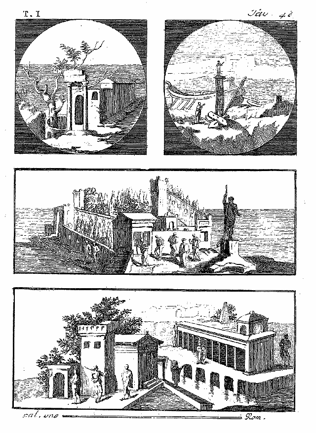CETTE planche réunit quatre morceaux servant d'ornemens dans l'édition royale, aux pages ci-après citées. Le premier rond (pag. 174) offre un paysage avec deux colonnes de front qui soutiennent un architrave faisant ruines. Dans l'autre rond (p. 251) sur une base élevée, on voit une statue qui pourrait être une Leucothée; en mer est un vaisseau, et dans le lointain une maison de plaisance. Le troisième de forme longue (pag. 151) représente une maison de campagne magnifique, avec plusieurs personnages; sur une base s'élève une statue de Neptune: Dans le quatrième (page 143) on voit une tour quarrée avec des fenêtres; un édifice somptueux soutenu dans l'eau sur des arcades; l'horizon, d'autres fabriques, parmi lesquelles on distingue une pyramide qui pourrait être un tombeau. On remarque dans cette peinture les deux figures portant des culottes, pièce de vêtement qu'on n'avait pas vu paraître jusqu'ici sur des monumens d'une date aussi ancienne, qui répond au règne de Titus, ou même qui le devance. La colonne Trajane en offre d'autres exemples; cependant, les auteurs de l'âge d'Auguste font déjà mention des campestria, espèce de culottes, et ils en supposent l'usage bien plus ancien.