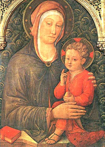 The reader must have remarked that, though the fundamental idea of the[59] enthroned Madonna is that of queenship, the Virgin wears no crown in any of the pictures thus far cited; the crowned Madonna is not characteristic of Italian art. It is found occasionally in mosaics from the eighth to the eleventh centuries, and in some of the early votive pictures, but does not appear in the later period except in a few Venetian pictures by Giovanni da Murano and Carlo Crivelli. The same idea was often carried out by placing two hovering angels over the Virgin's head, holding the crown between them. Botticelli's Madonna of the Inkhorn is treated in this way.