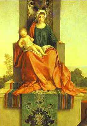 Glancing, briefly, at these scattered examples, we learn that the enthroned Madonna belongs to every school of Italian [48]art, and exhibits an astonishing variety of forms. Probably it was in the North of Italy that it flourished most. The Paduan School has its fine representation in Mantegna's picture, already referred to; the Brescian, in Moretto's Madonna of S. Clemente; the Veronese, in Girolamo dai Libri's splendid altar piece in San Giorgio Maggiore; the Bergamesque, in Lotto's Madonna of S. Bartolommeo. Above all, it was in Venice, the Queen City of the Adriatic, that the enthroned Madonna reached the greatest popularity: the spirit of the composition was peculiarly adapted to the Venetian love of pomp and ceremony.
