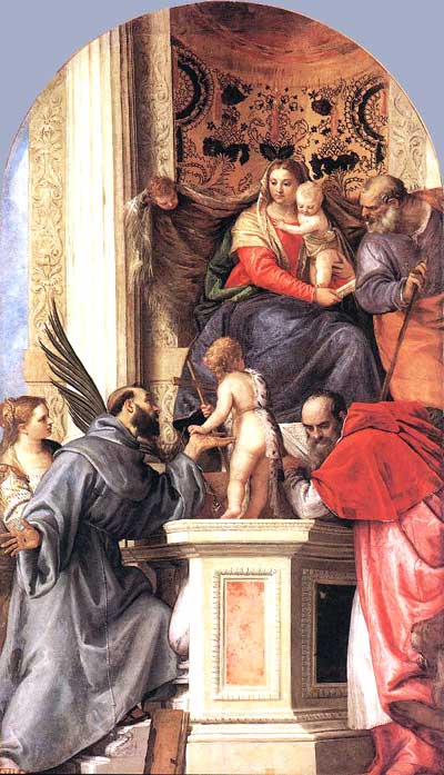 The peculiar qualities of art in Verona and Venice are blended in Paolo Veronese. No artist ever enjoyed more the splendors of color, or combined them in more enchanting harmonies. Such gifts transform the commonest materials, and, though his Virgin is a very ordinary woman, she has undeniable charms. An oft-copied figure, in this picture, is that of the little St. John, a universal favorite among child lovers.