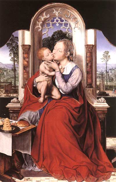 In the enthroned Madonna by Quentin[63] Massys, in the Berlin Gallery, we have many typical characteristics of Northern art. The throne itself is exceedingly rich, ornamented with agate pillars with embossed capitals of gold. The Virgin has the fine features and earnest, tender expression which recalls earlier Flemish painters. Her dress falls in rich, heavy folds upon the marble pavement. But, as with Van Eyck and Memling, Holbein and Schongauer, fine clothes do not conceal her girlish simplicity or her loving heart. A low table, spread with food, stands at the left,—a curious domestic element to introduce, and thoroughly Northern in realism.