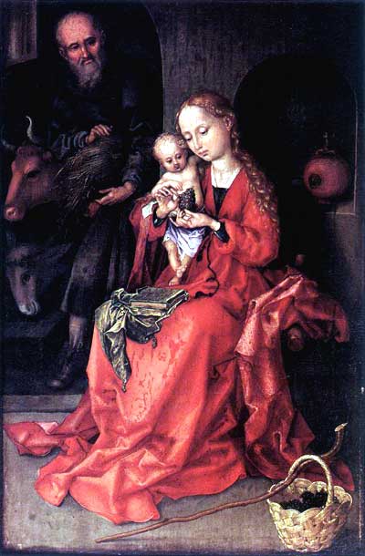 More frequently a domestic scene of this sort includes other figures belonging to the Holy Family. A typical German example is the picture by Schongauer in the Belvedere Gallery at Vienna. The Virgin is seated in homely surroundings, intent upon a bunch of grapes which she holds in her hands, and which she has taken from a basket standing on the floor beside her. Long, waving hair falls over [122]her shoulders; a snowy kerchief is folded primly in the neck of her dress; she is the impersonation of virgin modesty. Her baby boy stands on her lap, nestling against his mother; his eyes fixed on the fruit, his eager little face glowing with pleasure. Beyond are seen the cattle, which Joseph is feeding. He pauses at the door, a bundle of hay in his arms, to look in with fond pride at his young wife and her child.
