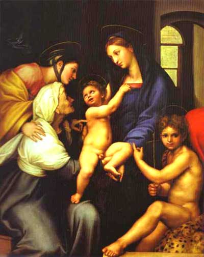 To Giulio Romano also, according to recent criticism, is due the domestic Madonna known as the "Impannata," and usually attributed to Raphael. It is probable that both artists had a hand in it, the master in the arrangement of the composition, the pupil in its execution. A bed at one side is concealed by a green curtain. In the rear is the cloth-covered window which gives the picture its name. Elizabeth and Mary Magdalene have [126]brought home the child, who springs to his mother's arms, smiling back brightly at his friends. One other Madonna from Raphael's brush (the Orleans) has an interior setting, but the domestic environment here is undoubtedly the work of some Flemish painter of later date.