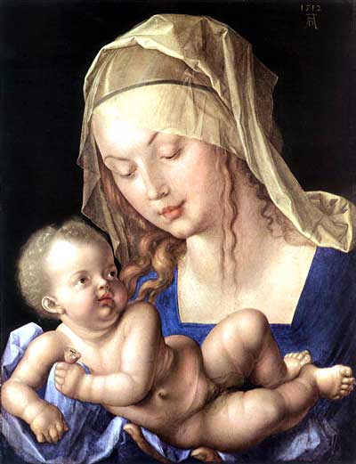This entire absence of posing on the part of the German Virgin is one of the most admirable elements in this art. This characteristic is perfectly illustrated in Dürer's portrait Madonna of the Belvedere Gallery, at Vienna. This is an excellent specimen of the master, who, alone of the Germans, is considered the peer of his great Italian contemporaries. Frankly admired both by Titian and Raphael, he has in common with them [153]the supreme gift of seeing and reproducing natural human affections. His work, however, is as thoroughly German as theirs is Italian. The Madonna of this picture has the round, maidenly face of the typical German ideal. A transparent veil droops over the flowing hair, covered by a blue drapery above. The mother holds her child high in her arms, bending her face over him. The babe is a beautiful little fellow, full of vivacity. He holds up a pear gleefully, to meet his mother's smile. The picture is painted with great delicacy of finish.