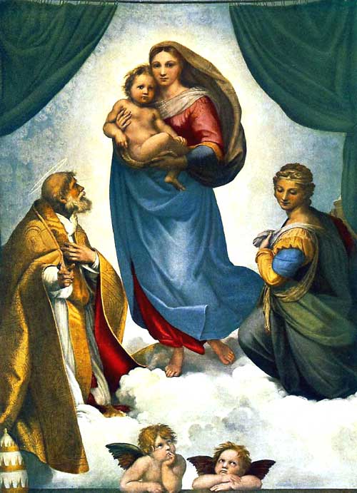 One more picture remains for us to consider as an illustration of the Madonna as Witness. Had we mentioned it first, nothing further could have been said on the subject. The Sistine Madonna is the greatest ever produced, from every point of view. We have already noted the superiority of its artistic composition over all other enskied Madonnas, and are the more ready to appreciate its higher merits; for its strongest hold upon our admiration is in its moral and religious significance. Its theme is the transfiguration of loving and consecrated motherhood. Mother and child, united in love, move towards the glorious consummation of the heavenly kingdom.