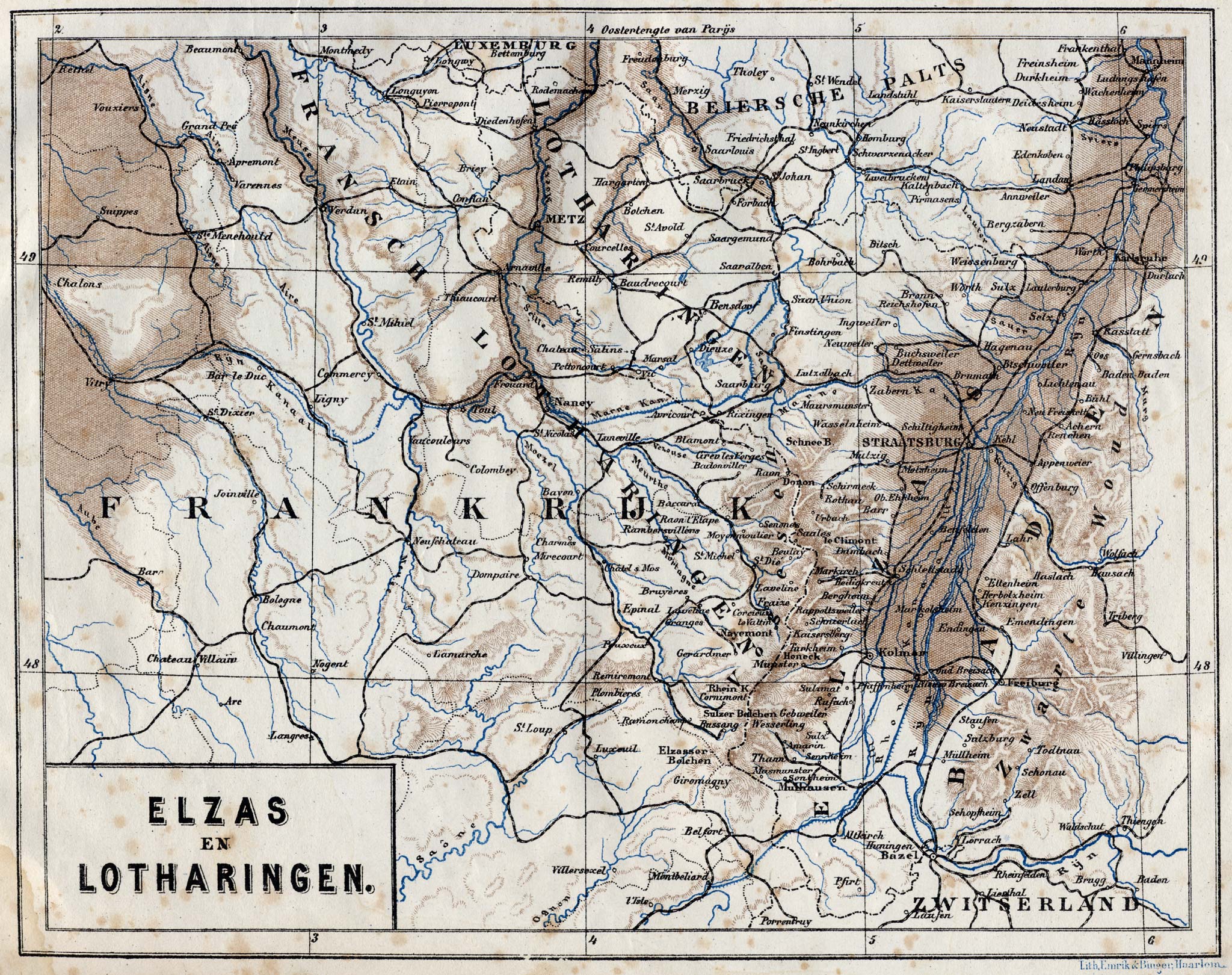 Dadelijk nadat de Rijn, bij Bazel, de breede kloof tusschen de uitloopers van den Jura en het Schwarzwald verlaten heeft, raakt hij de grens van den Elzas. Op de Alpengletschers geboren en gevoed door talrijke beken en stroomen, die aan alle zijden van den Sint-Gothard, het centraalpunt der zwitsersche Alpenketen, afdalen, richt de prachtige rivier haar loop naar het meer Constanz, waarin zij zich tijdelijk verliest en als het ware de eerste periode van haar leven afsluit. Het schilderachtige zwabische meer verlatende, stroomt de Rijn naar het groote keerpunt bij Bazel, na vooraf de Limmatt en de Reuss, onder den naam van Aar tot eene belangrijke rivier vereenigd, te hebben opgenomen. De lengte van den Rijn, van zijn oorsprong in Grauwbunderland tot aan zijn uitloop in de Noordzee, bedraagt dertienhonderd-zes-en-twintig kilometers, waarvan vierhonderd-veertig tot de kromming bij Bazel en tweehonderd langs do grenzen van den Elzas. Bij het Tomameer in Grauwbunderland, dartelt de pas geboren rivier op eene hoogte van tweeduizend-driehonderd-vier-en-veertig meter boven de zee; in het meer van Constanz bedraagt die hoogte driehonderd-vier-en-tachtig meter; bij de brug te Bazel, tweehonderd-zes-en-twintig meter; bij de brug te Kehl, honderd-vijf-en-dertig meter, en te Lauterburg honderd meter: alles berekend naar het nulpunt van het amsterdamsche peil.—Het vermogen der rivier bedraagt tegenwoordig ter hoogte van Bazel, gemiddeld achthonderd kubiek meter, maar wisselt tusschen de tweehonderd en [392]twaalfhonderd kubiek meters en meer. Bij sterken was heeft men, in het einde van December 1882, te Kehl een afvoer gehad van vijf- tot zesduizend kubiek meter per sekonde.