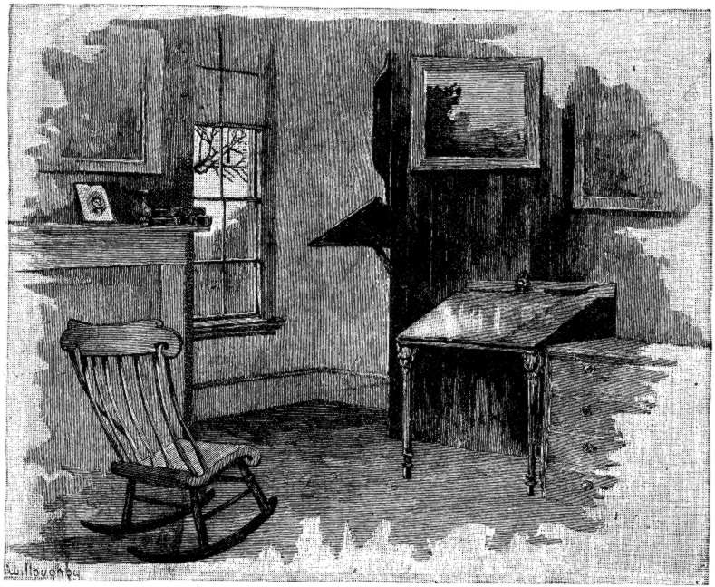 In memory of the brave who found in Concord "a birthplace, home or grave" the plain shaft in the public square was erected on the spot where the Minute-men were probably first drawn up on the morning of the nineteenth of April. 1775 to listen to the inspiring words of their young preacher, Rev. William Emerson, and ninety years after in the same place his grandson R.W. Emerson recounted the noble deeds of the men who had gallantly proved themselves worthy to bear the names made famous by their ancestors at Concord fight. The Rev. William Emerson in 1775 occupied and owned The Old Manse, which was built for him about ten years before, on the occasion of his marriage to Miss. Phoebe Bliss, the daughter of one of the early ministers of Concord. Mr. Emerson was so patriotic and eager to attack the invaders at once, that he was compelled by his people to remain in his house, from which he is said to have watched the battle at the bridge from a window commanding the field. He soon after joined the army as chaplain and died the next year at Rutland, and his widow married some years after the Rev. Dr. Ripley who succeeded him in his church and home, and lived until his death in the Manse which has always remained in the possession of his descendants. Dr. Ripley ruled the church and town with the iron sway of an old-fashioned New England minister, and the old Manse has for years been a literary centre. In the old dining room, the solemn conclave of clergymen have cracked many a hard doctrine and many a merry jest, seated in the high-backed leather chairs which have stood for one hundred and twenty years around the old table. Here Mrs. Sarah Ripley fitted many a noted scholar for college in the intervals of her housekeeping labors [229] before the open kitchen fireplace. In an attic room, called the Saint's chamber, from the penciled names of honored occupants, Emerson is said to have written Nature, and perhaps other works, as much of his time was spent in the Manse at various periods of his life. Here Hawthorne came on his wedding tour and lived for two happy years and wrote the Mosses from an Old Manse and other works. In his study over the dining-room, his name is written with a diamond on one of the little window panes, and with the same instrument his wife has recorded on the dining-room window annals of her daughter who was born in the house.