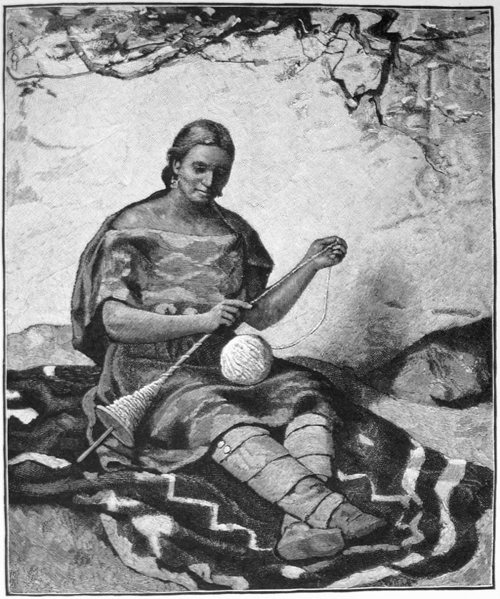 § II. Cotton, which grows well in New Mexico and Arizona, the tough fibers of yucca leaves and the fibers of other plants, the hair of different quadrupeds, and the down of birds furnished in prehistoric days the materials of textile fabrics in this country. While some of the Pueblos still weave their native cotton to a slight extent, the Navajos grow no cotton and spin nothing but the wool of the domestic sheep, which animal is, of course, of Spanish introduction, and of which the Navajos have vast herds.