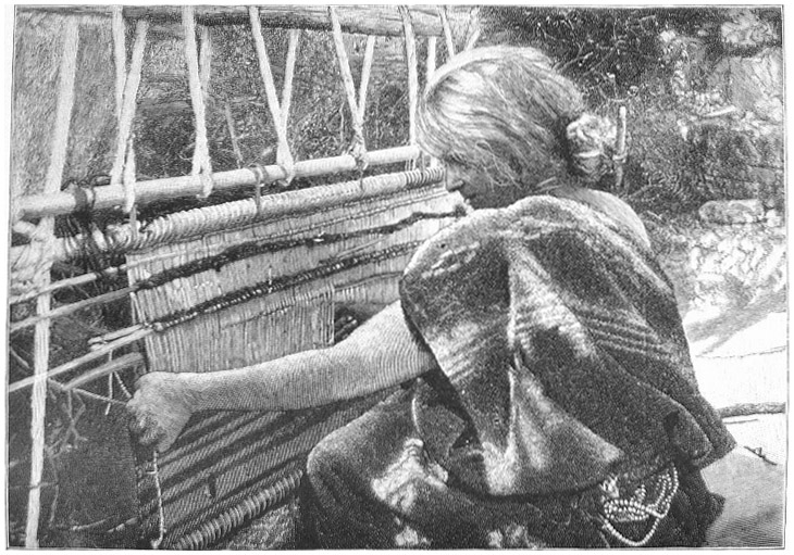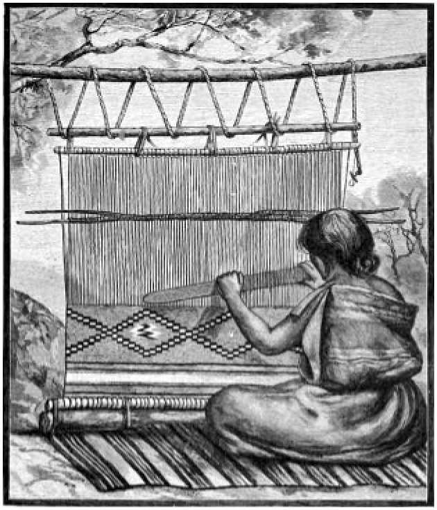 § XI. I will close by inviting the reader to compare Plate XXXVI and Fig. 59. The former shows a Navajo woman weaving a belt; the latter a girl of ancient Mexico weaving a web of some other description. The one is from a photograph, taken from life; the other I have copied from Tylor's "Anthropology" (p. 248); but it appears earlier in the copy of Codex Vaticana in Lord Kingsborough's "Antiquities of Mexico." The way in which the warp is held down and made tense, by a rope or band secured to the lower beam and sat upon by the weaver, is the same in both cases. And it seems that the artist who drew the original rude sketch, sought to represent the girl, not as working "the cross-thread of the woof in and out on a stick," but as manipulating the reed-fork with one hand and grasping the heald-rod and shed-rod in the other.