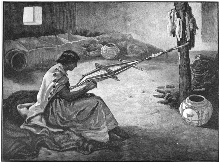 § I. The art of weaving, as it exists among the Navajo Indians of New Mexico and Arizona, possesses points of great interest to the student of ethnography. It is of aboriginal origin; and while European art has undoubtedly modified it, the extent and nature of the foreign influence is easily traced. It is by no means certain, still there are many reasons for supposing, that the Navajos learned their craft from the Pueblo Indians, and that, too, since the advent of the Spaniards; yet the pupils, if such they be, far excel their masters to-day in the beauty and quality of their work. It may be safely stated that with no native tribe in America, north of the Mexican boundary, has the art of weaving been carried to greater perfection than among the Navajos, while with none in the entire continent is it less Europeanized. As in language, habits, and opinions, so in arts, the Navajos have been less influenced than their sedentary neighbors of the pueblos by the civilization of the Old World.