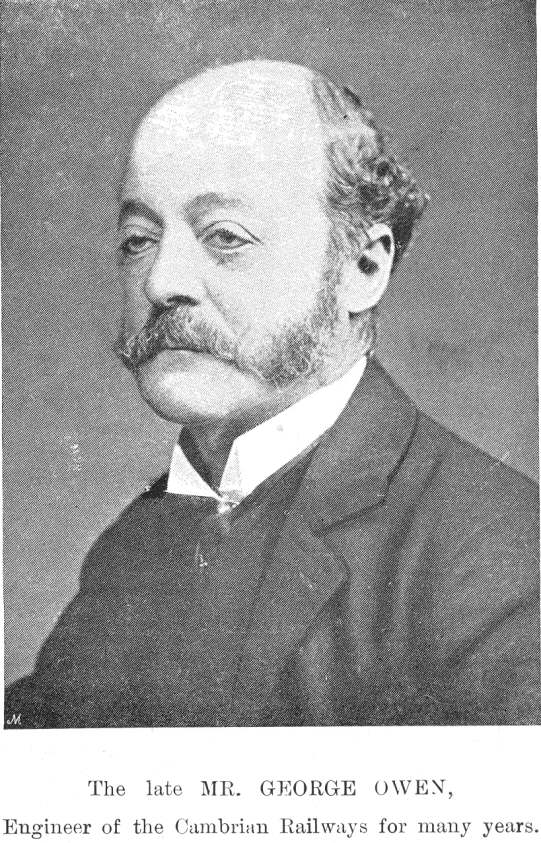 Caught by the spirit of venture and enthusiasm, which had swept over the country after the successful opening of the Manchester and Liverpool Railway in 1830, his thoughts had begun to turn to railway production, and the meeting with the young Montgomeryshire road and bridge builder opened the looked for door. In a room over the tobacconist shop now occupied by Mr. Richards, opposite the Post Office, in Church Street, Oswestry, and close to the premises in which, some fifteen or sixteen years earlier another notable man, Shirley Brooks, afterwards editor of “Punch,” had toiled as a lawyer’s article pupil to his uncle, Mr. Charles Sabine, Mr. Davies and Mr. Savin were brought together by Mr. George Owen, himself destined to play no small part in the planning of the Cambrian. A man of Kent, native of Tunbridge Wells, Mr. Owen had begun his business career p. 7in the office of Mr. Charles Mickleburgh, land surveyor, agent and enclosure commissioner, of Montgomery, one of whose daughters he subsequently married. He worked side by side with another young engineer, of whom we shall hear more presently,—Mr. Benjamin Piercy, under whose initial leadership, Mr. Owen, as resident engineer, was to serve the local railway for many a long year. Nor was that the only capacity in which his gifts were displayed. Making Oswestry his home, he became a member of the Town Council in 1860, mayor in 1864 and 1865, and alderman in 1874. For twenty years he was a member of the General Purposes Committee, served as borough and county magistrate, and was a member of the School Board from its inception, and chairman from 1891 till his death in 1901. Indeed, there was no interest in the town,—administrative, commercial and recreative,—in which he did not fill a conspicuous role. But, perhaps, of all his services to the community, none was more opportune or more prolific of far-reaching results than that happy inspiration of introducing Messrs. Davies and Savin.